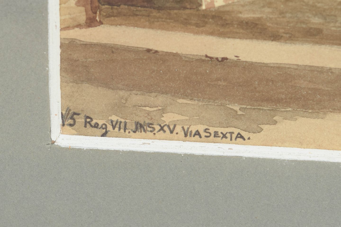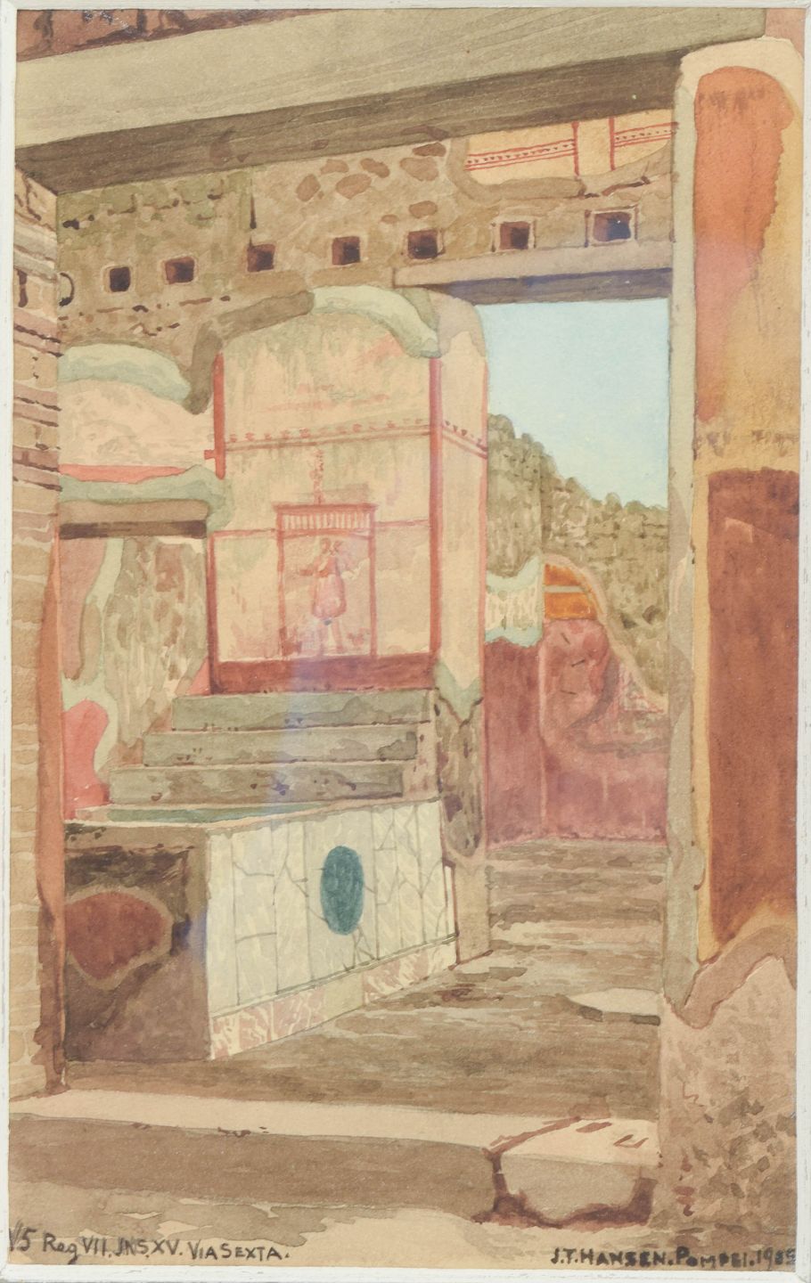 Architectural view from Pompeii with classical building fragments and spatial perspective, executed as a watercolour in muted earth tones and warm ochres. Signed and dated Pompeii 1905.