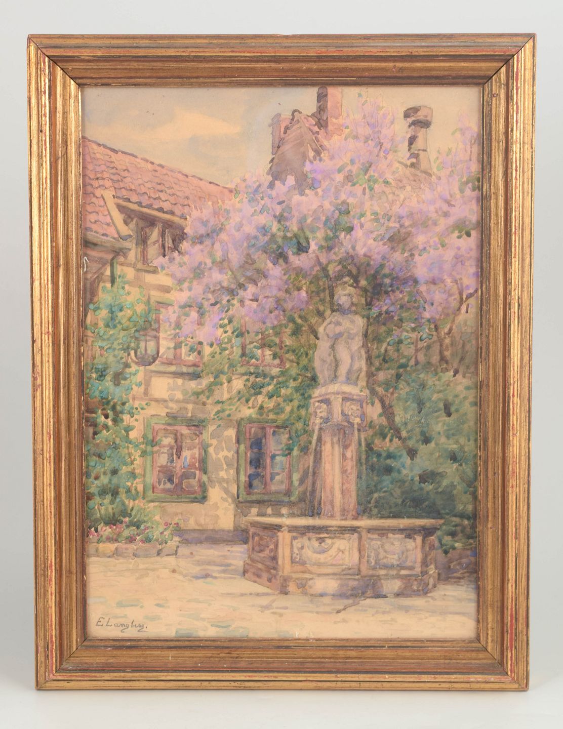 Atmospheric town view from a German city with architecture and a central fountain in a flowering courtyard, executed as a watercolour on paper, signed.