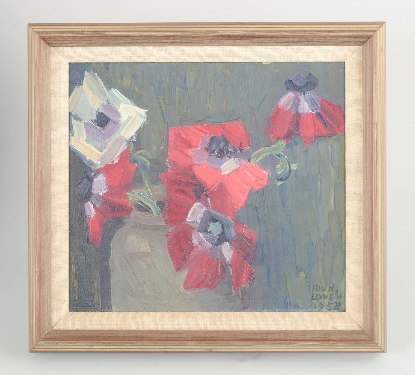 Floral composition executed in a free and painterly style with visible brushwork and a muted background that accentuates the red and light-toned flower forms. Signed and dated 1958.