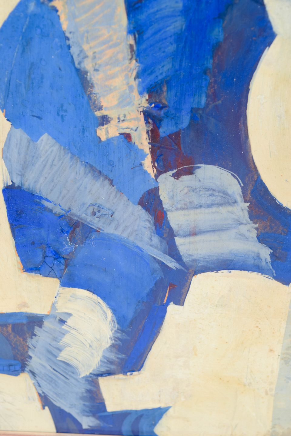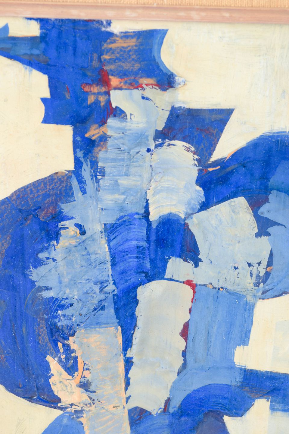 Abstract modernist composition in oil on board with dynamic, layered brushwork in blue and white tones, signed and presented in a frame.