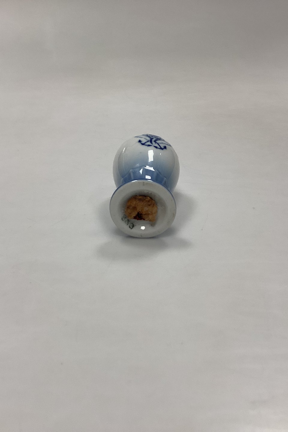 Bing and Grondahl Blue Tone Salt Shaker No. 52 A with Logo. Logo with crown, wheel with wings and anchors is most likely from a shipping company. Measures 7.5 cm / 2.95 in.