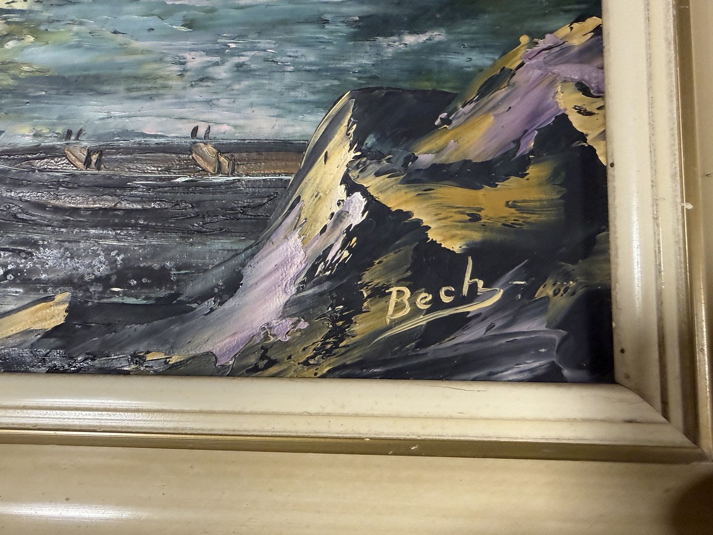 Bech Vogt-Sørensen (1919-?), Oil painting on canvas of sea and island in moonlight, signed Bech, Dimensions with frame: 56.5x47.5cm
