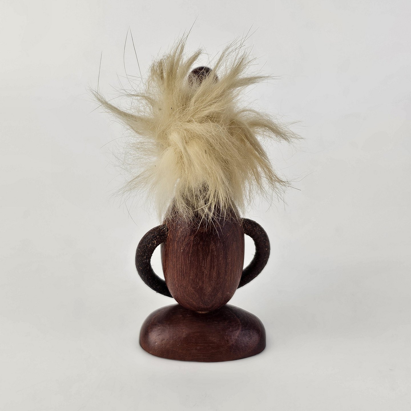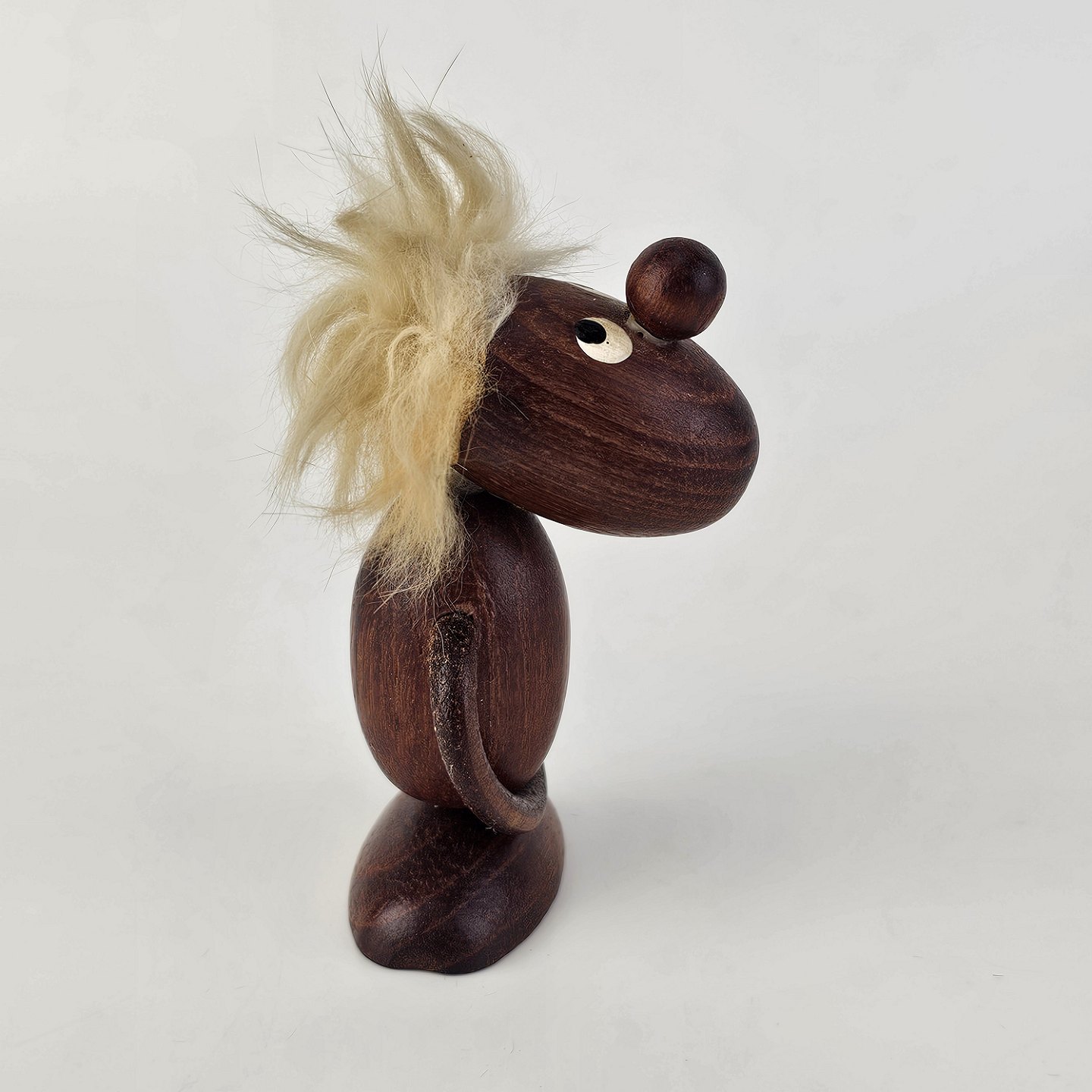 Håndskåret figur af teak med blond hår og arme af læder. Fra 1960'erne