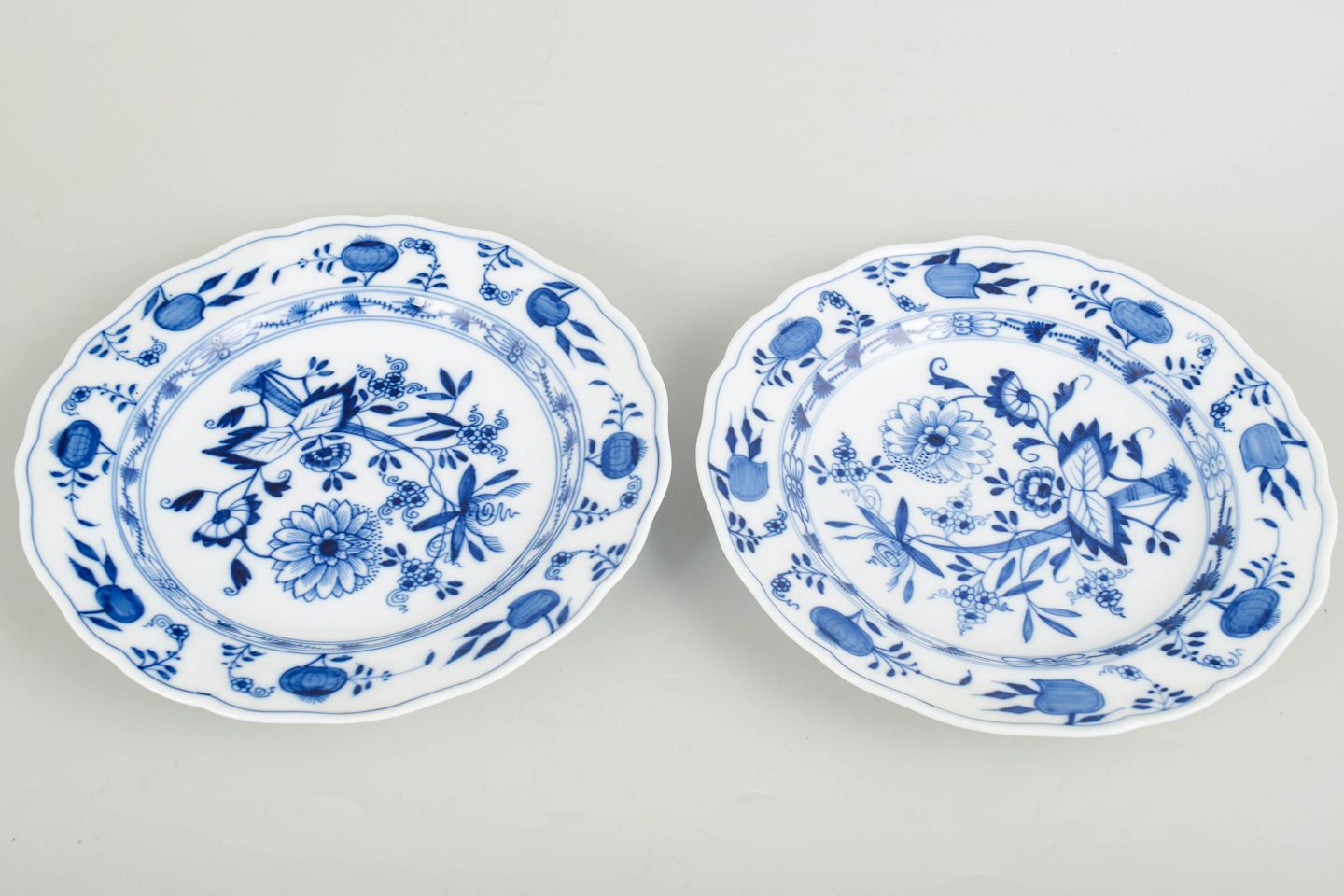 Dinner plates in white porcelain decorated with the underglaze blue Blue Onion pattern and a scalloped rim. Marked to the base with the Meissen crossed swords.