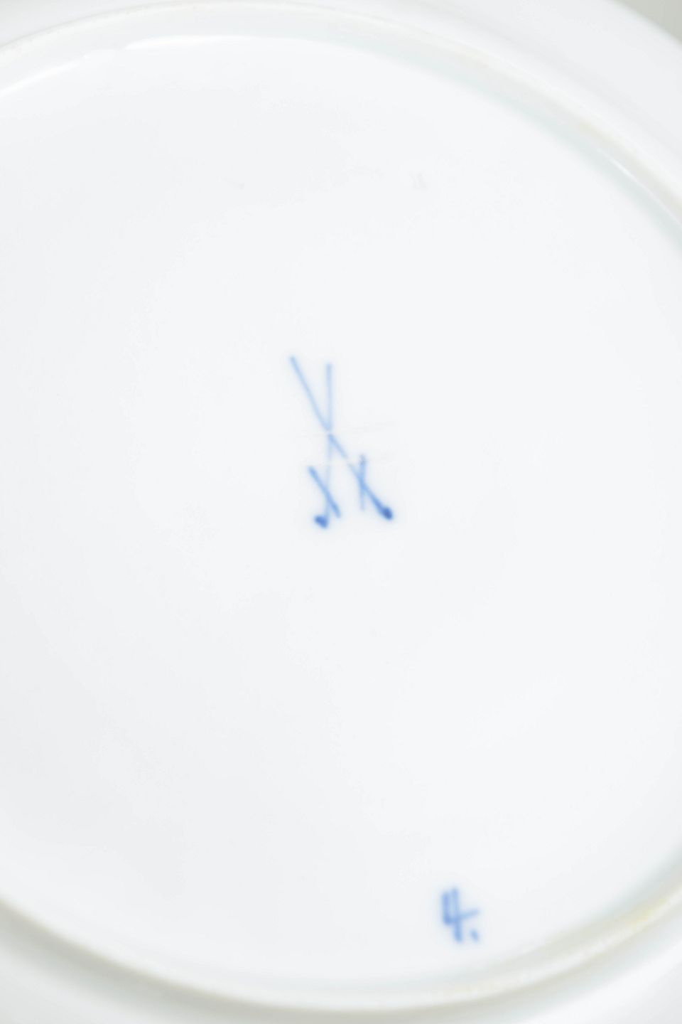 The Blue Onion pattern was introduced by Meissen in 1739 and was inspired by East Asian porcelain, featuring stylised floral and fruit motifs rendered in underglaze blue. It became one of the manufactory’s most enduring tableware designs. Around 1900, Meissen continued producing Blue Onion services of consistently high quality, with dinner plates forming a key part of the service and reflecting the manufactory’s long-standing standards of craftsmanship and decorative clarity.