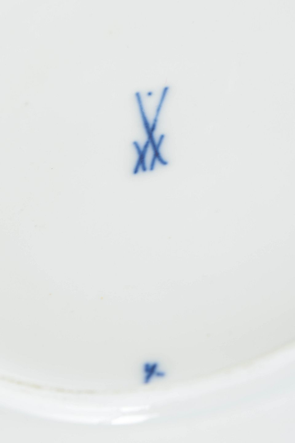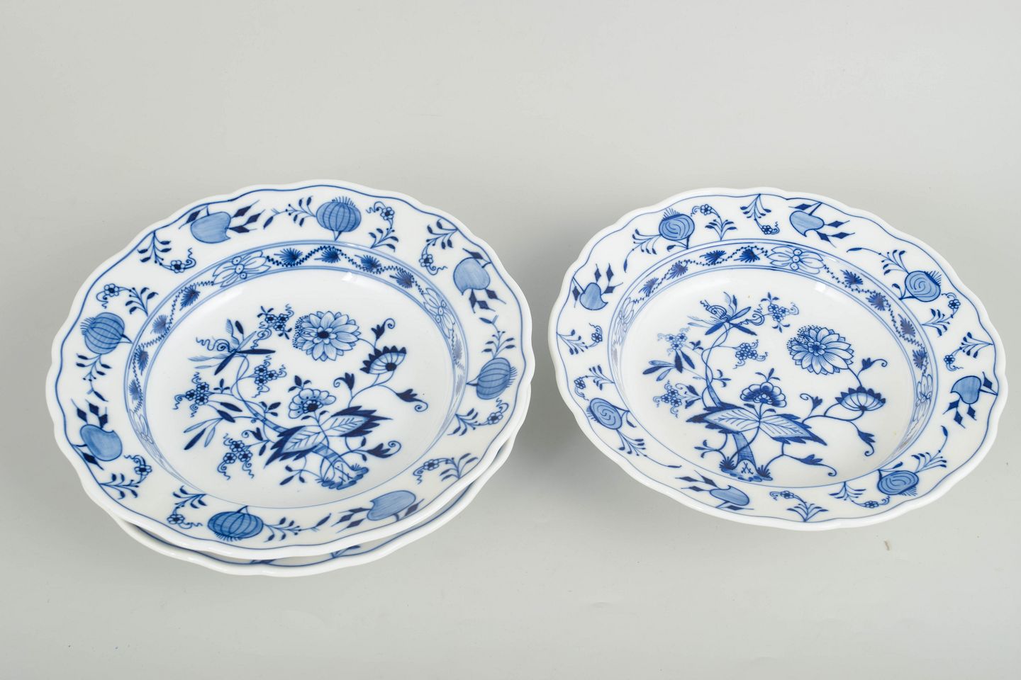 Deep plates in white porcelain decorated with the underglaze blue Blue Onion pattern and a scalloped rim. Marked to the base with the Meissen crossed swords.
