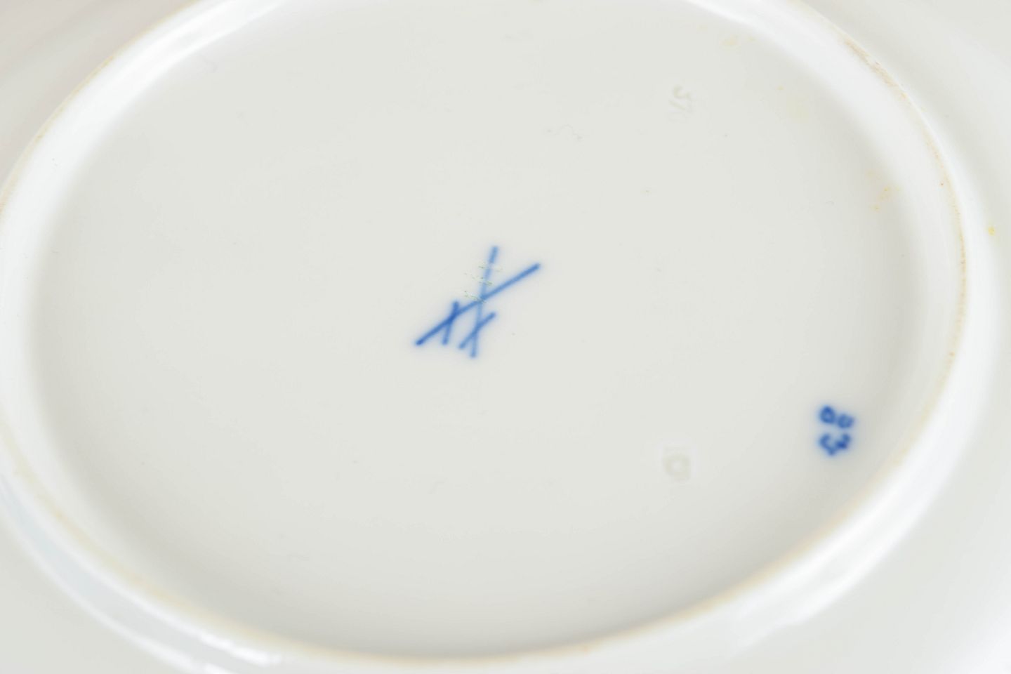 Round plates in white porcelain decorated with the underglaze blue Blue Onion pattern and a scalloped rim. Marked to the base with the Meissen crossed swords. Some examples cancelled with two incised lines, others with three.
