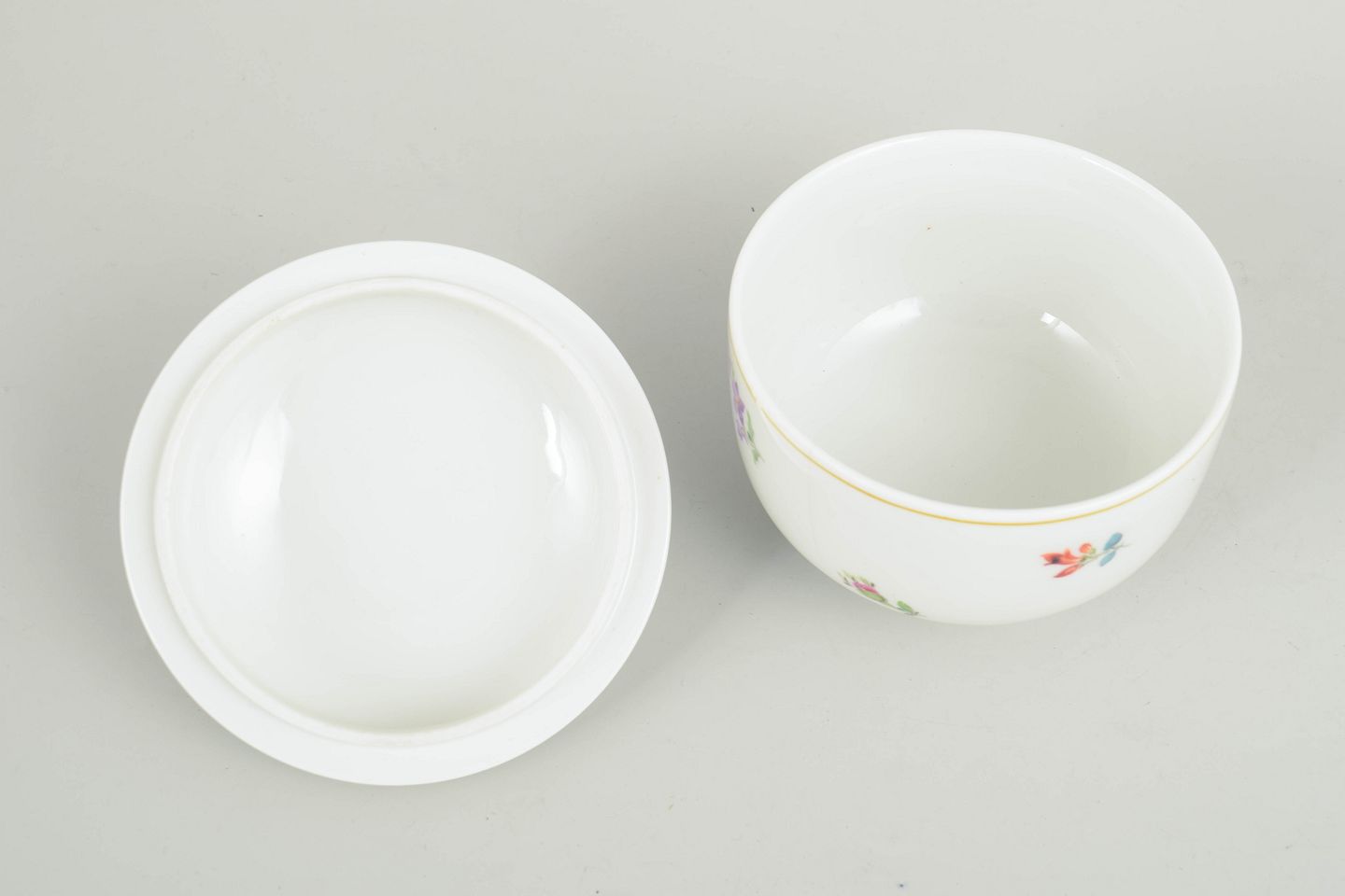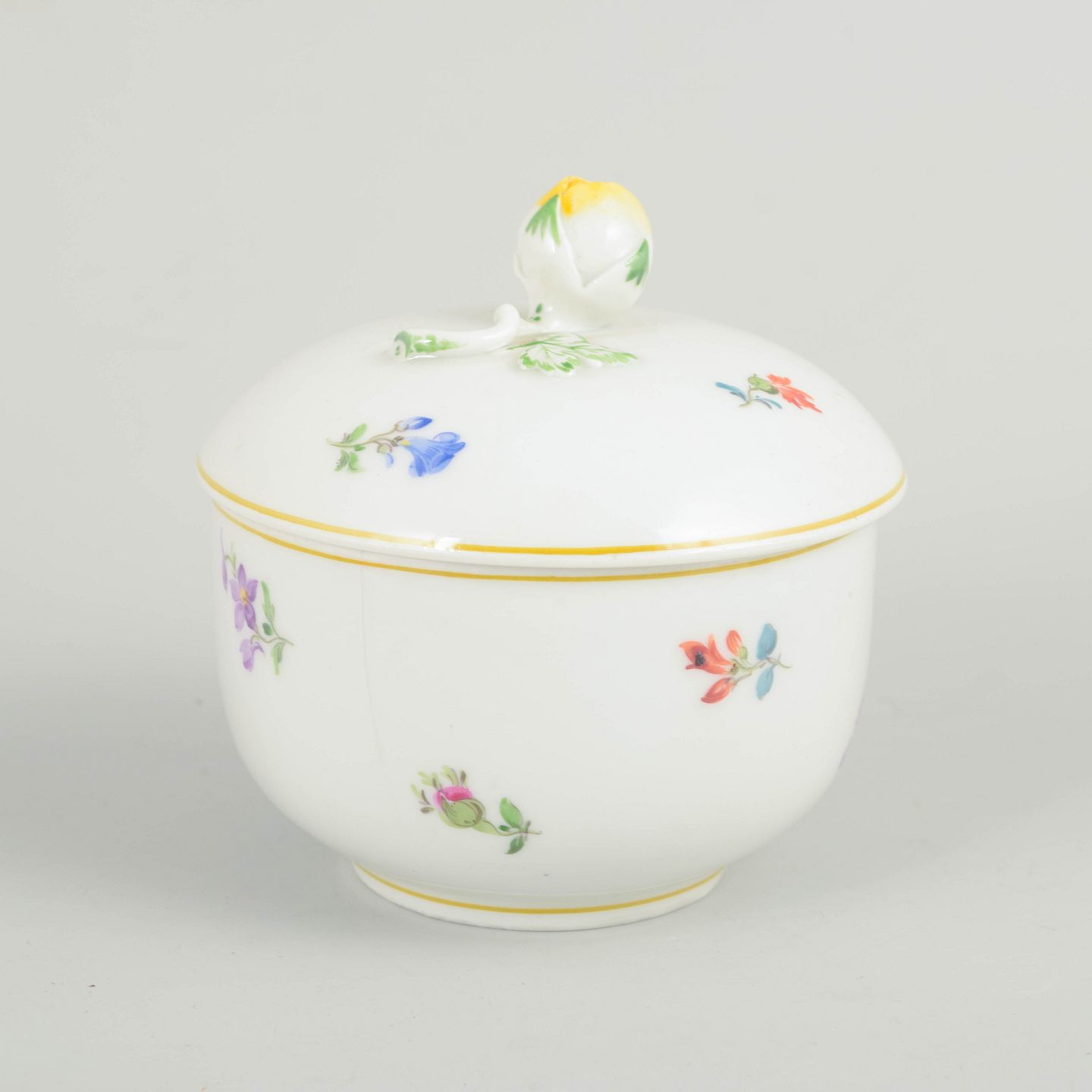 Round lidded bowl in white porcelain decorated with scattered hand-painted polychrome flowers and subtle gilt detailing to the rim and foot. The finial is formed as a rosebud. Marked to the base with the Meissen crossed swords.