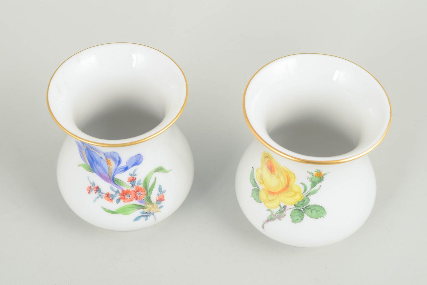 Small baluster-shaped miniature vases in white porcelain, decorated with hand-painted polychrome floral bouquets and finished with a gilt rim. Marked to the base with the Meissen crossed swords.