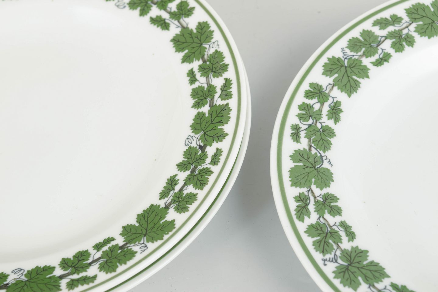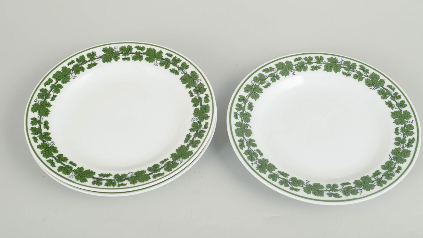 Round porcelain plates decorated with a green vine leaf border. First quality, marked with the Meissen crossed swords.