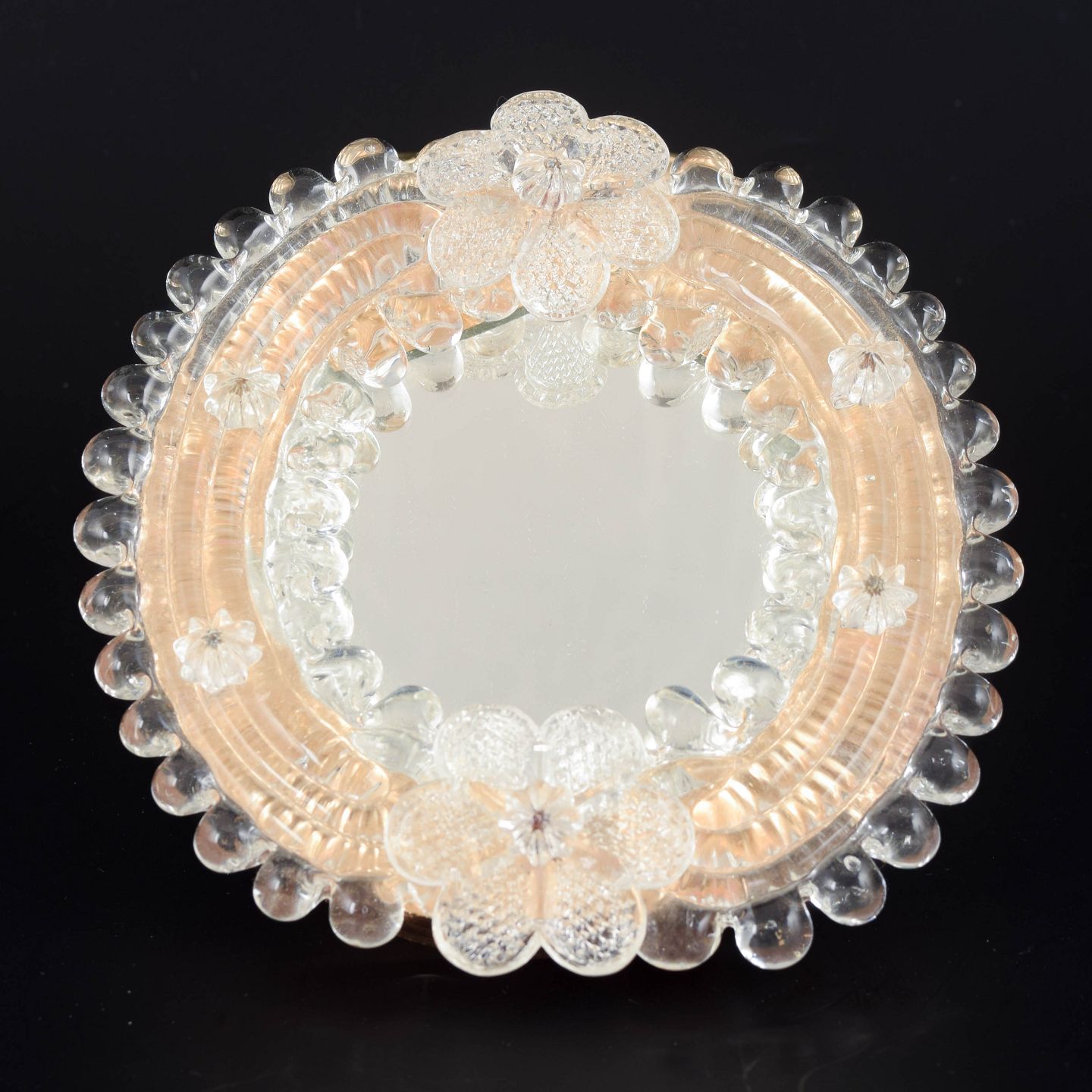 Small decorative wall mirror with a frame of hand-shaped Murano glass in warm rose tones and clear glass. The frame is composed of applied floral and bud-like elements with ribbed and bubbled textures, characteristic of Venetian glass design from the mid-20th century. The mirror plate is centrally set within the sculptural glass frame.