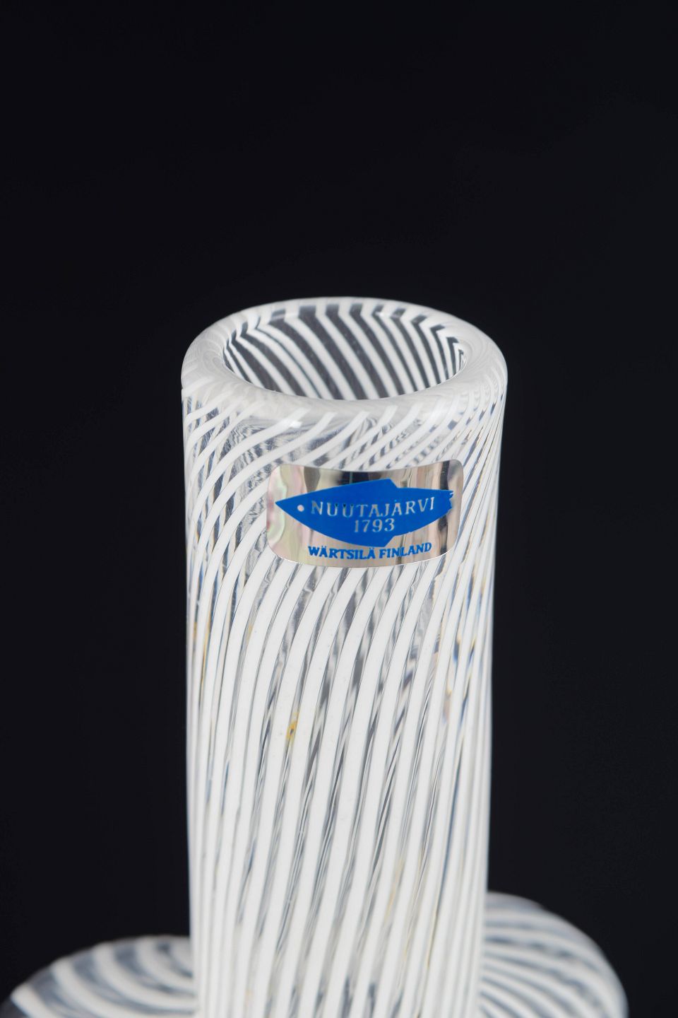Slender bottle-shaped vase in clear art glass with integrated white spiral and thread pattern executed in layered technique. The piece is mouth-blown and retains its original Nuutajärvi 1793 Wärtsilä Finland sticker, as well as a signature. The form and optical decoration are characteristic of Finnish art glass from the 1970s.