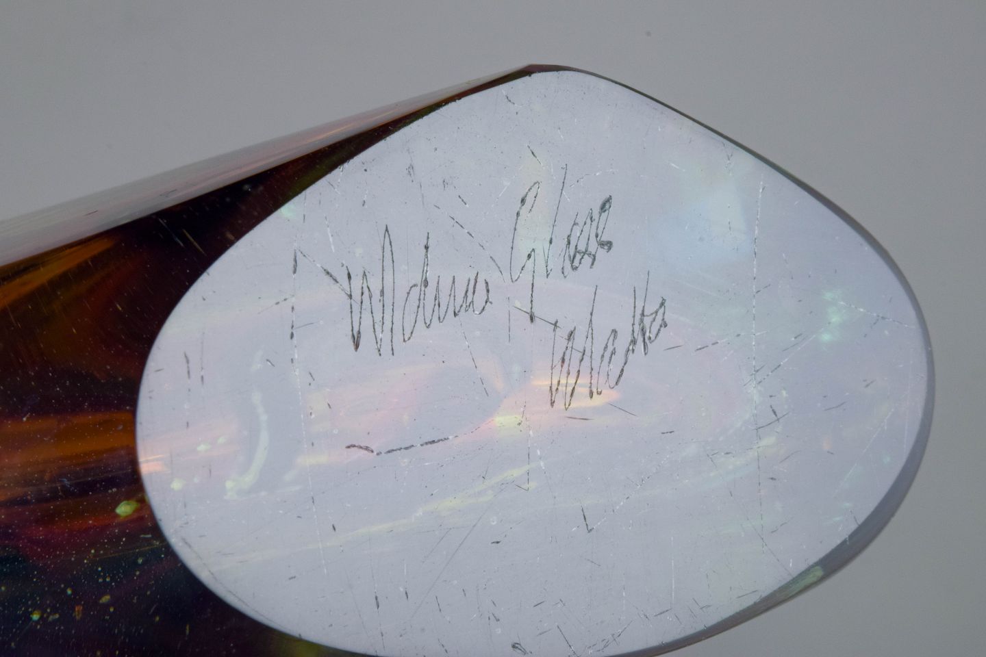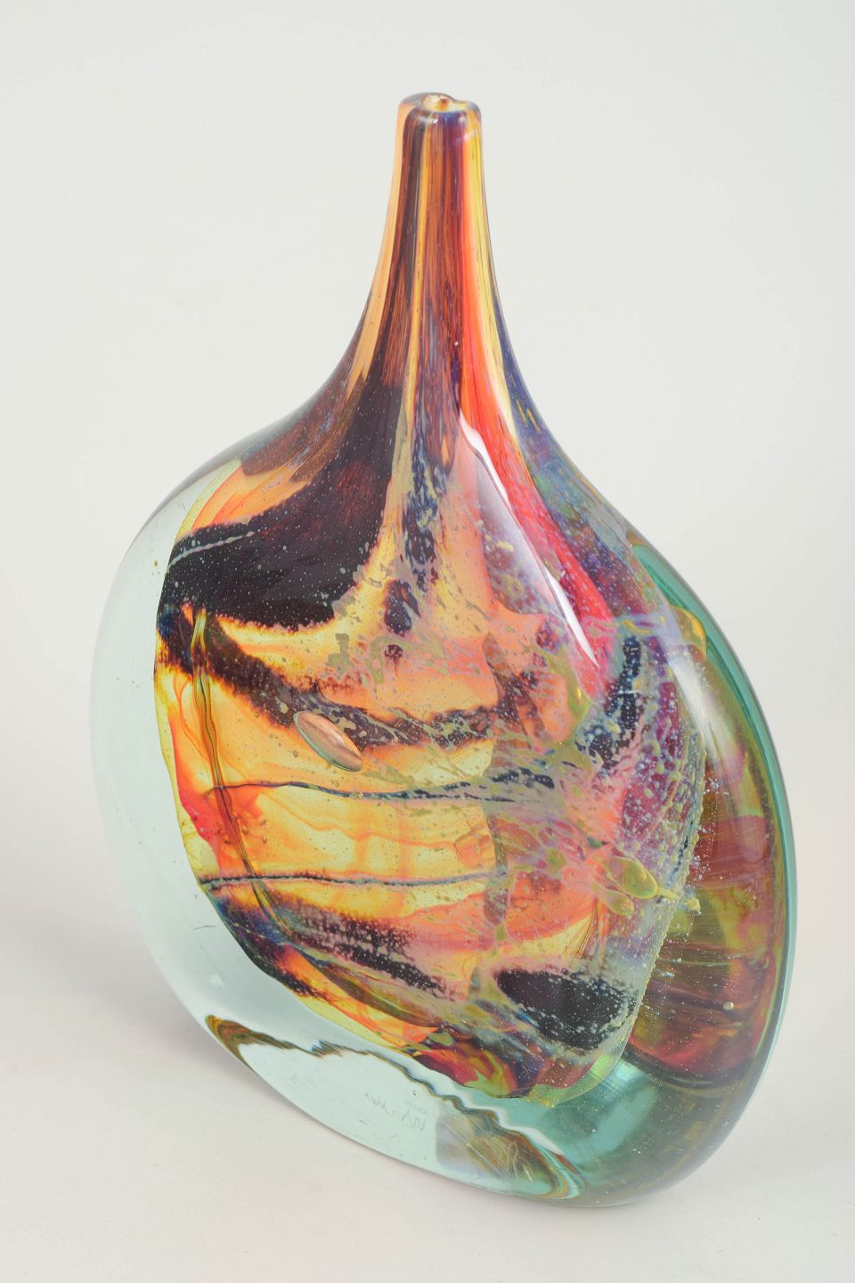 Organically shaped art glass vase in heavy, hand-blown glass with encapsulated swirling colours in amber, orange, and dark contrasting tones, finished with a clear outer layer. Freely formed asymmetric profile with pronounced weight in the base. Signed to the underside “Mdina glass, Malta”.