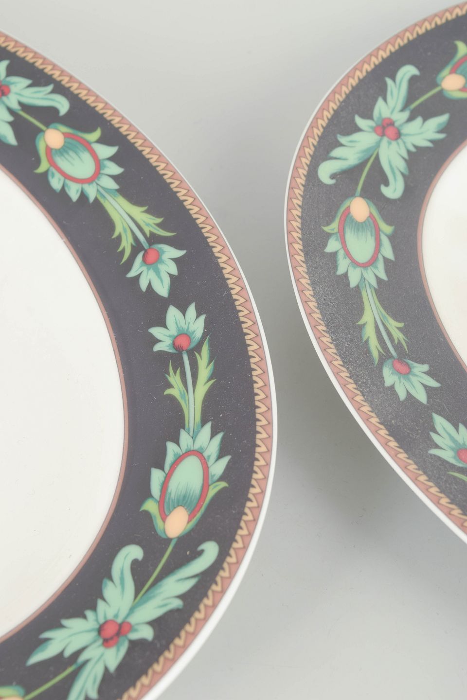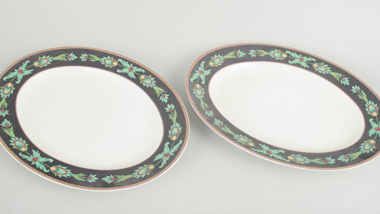 Set of two oval porcelain dishes by Rosenthal Classic from the Mayfair series, decorated with a dark border, stylised green foliate motifs and gilt detailing, produced in the 1980s.