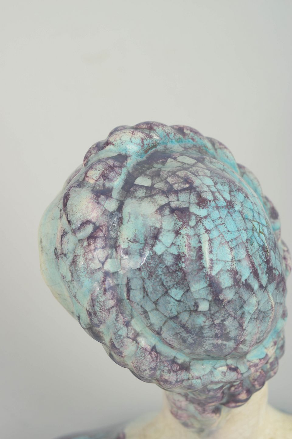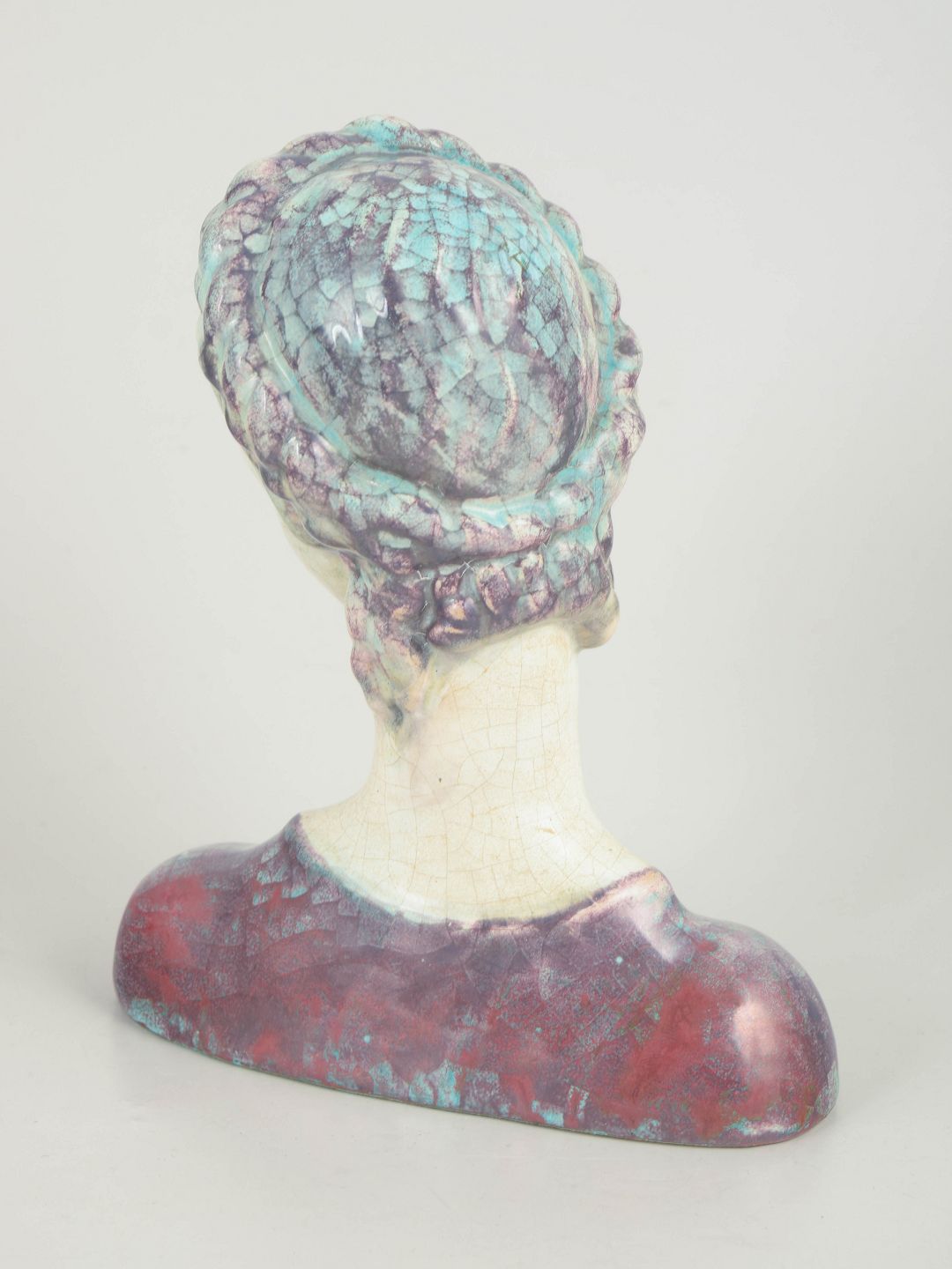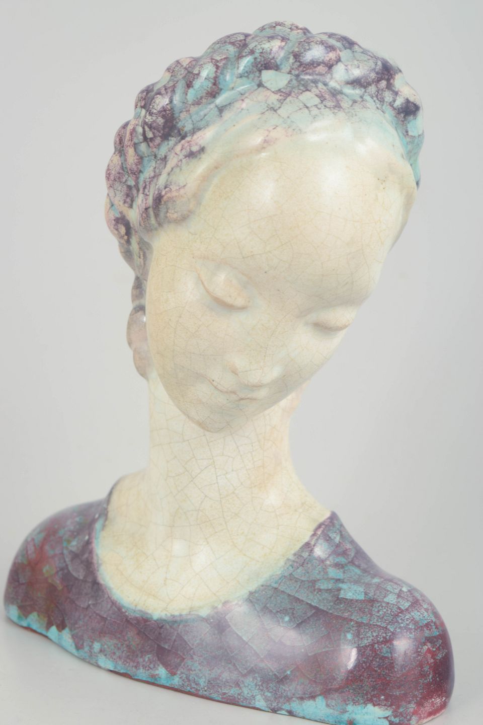 Elegant female bust in stoneware executed in an Art Deco-inspired style, with stylised hair and a gently inclined head. Finished in crackled glazes in subdued cream, violet and turquoise tones. Produced on Bornholm and marked on the base with the oval M.A.&S. stamp.