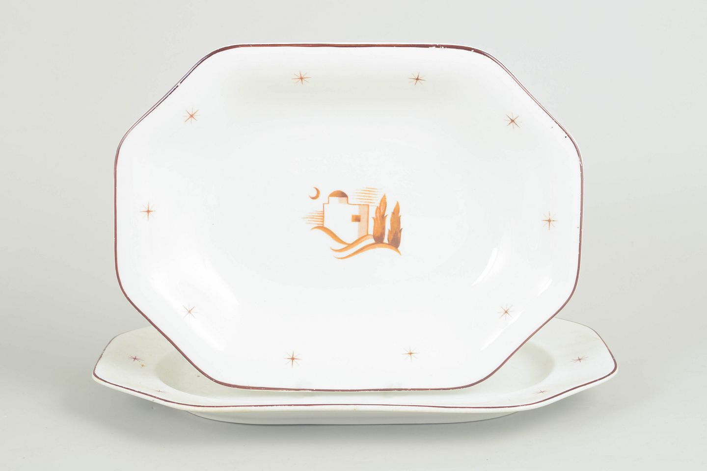 Dishes in glazed earthenware with a faceted form, brown border line and star motifs, featuring a central oriental landscape motif. Orient model. Two closely related sizes.