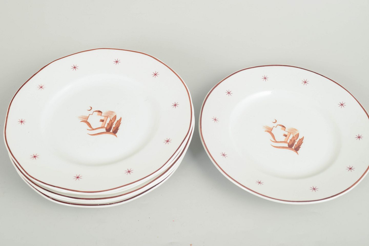 Small plates in glazed earthenware with a scalloped rim, brown border line and star motifs, featuring a central oriental landscape motif. Orient model.