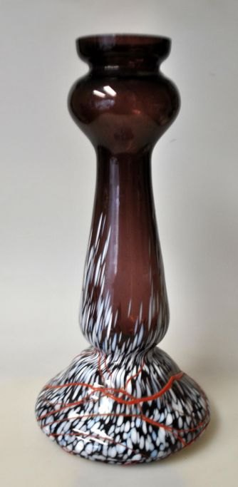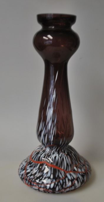 Jugend vase, ca. 1900, Germany. Violet glass with a base of white, blue and grey glass. Red glass line above. H.: 29.5 cm.