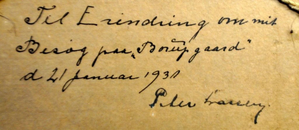 Verso description: In memory of my visit to "Borupgaard" on January 21, 1931. Signed Peter Lassen.