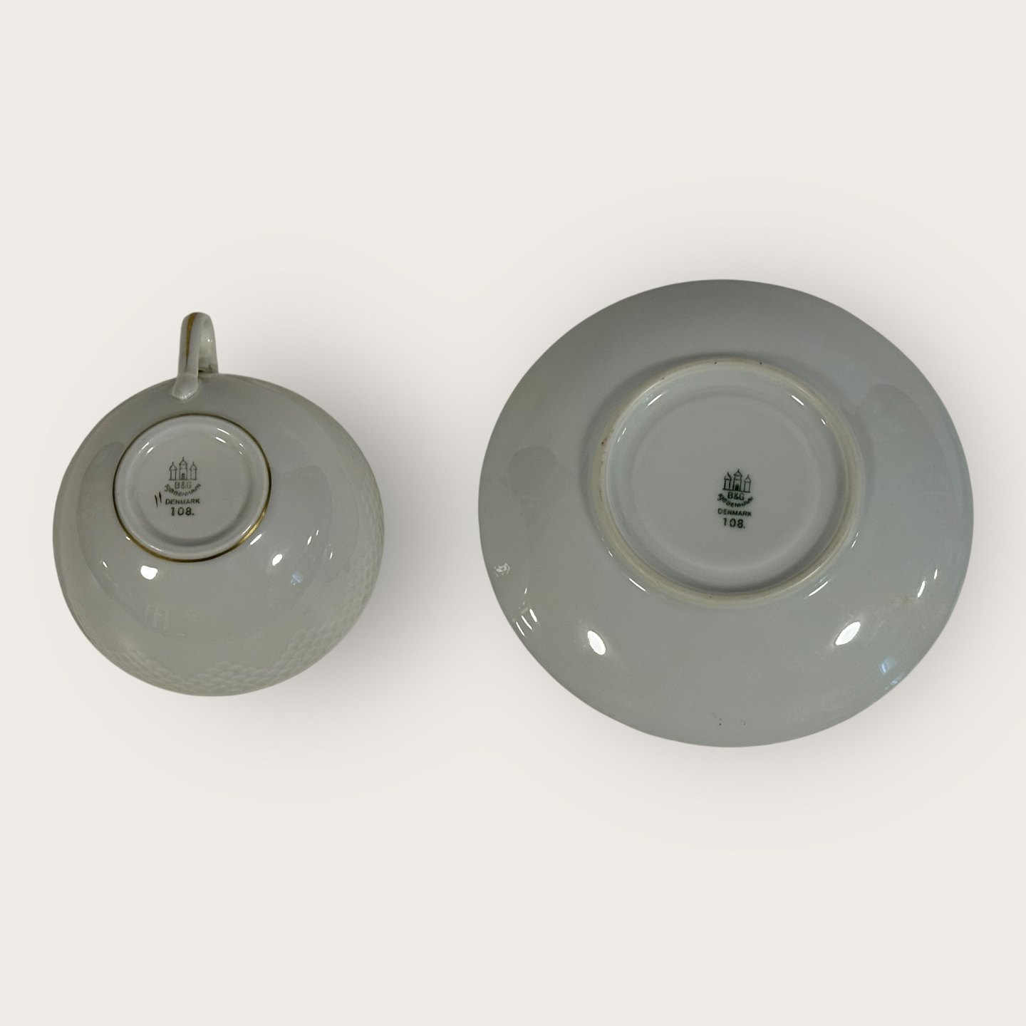 Bing & Grondahl, Aakjær, White porcelain with gold rim, Teacup set #108, 5cm high, 10cm in diameter, 1st grade *Good condition*