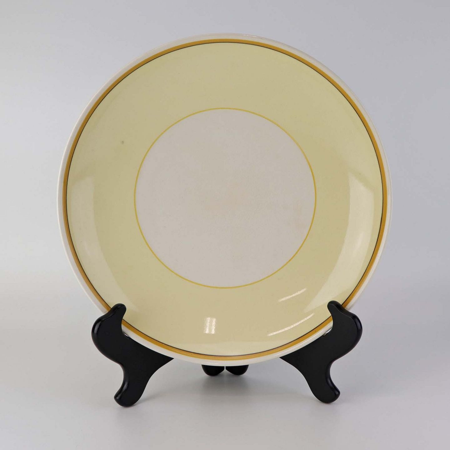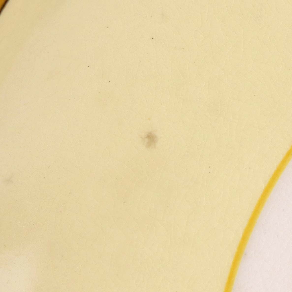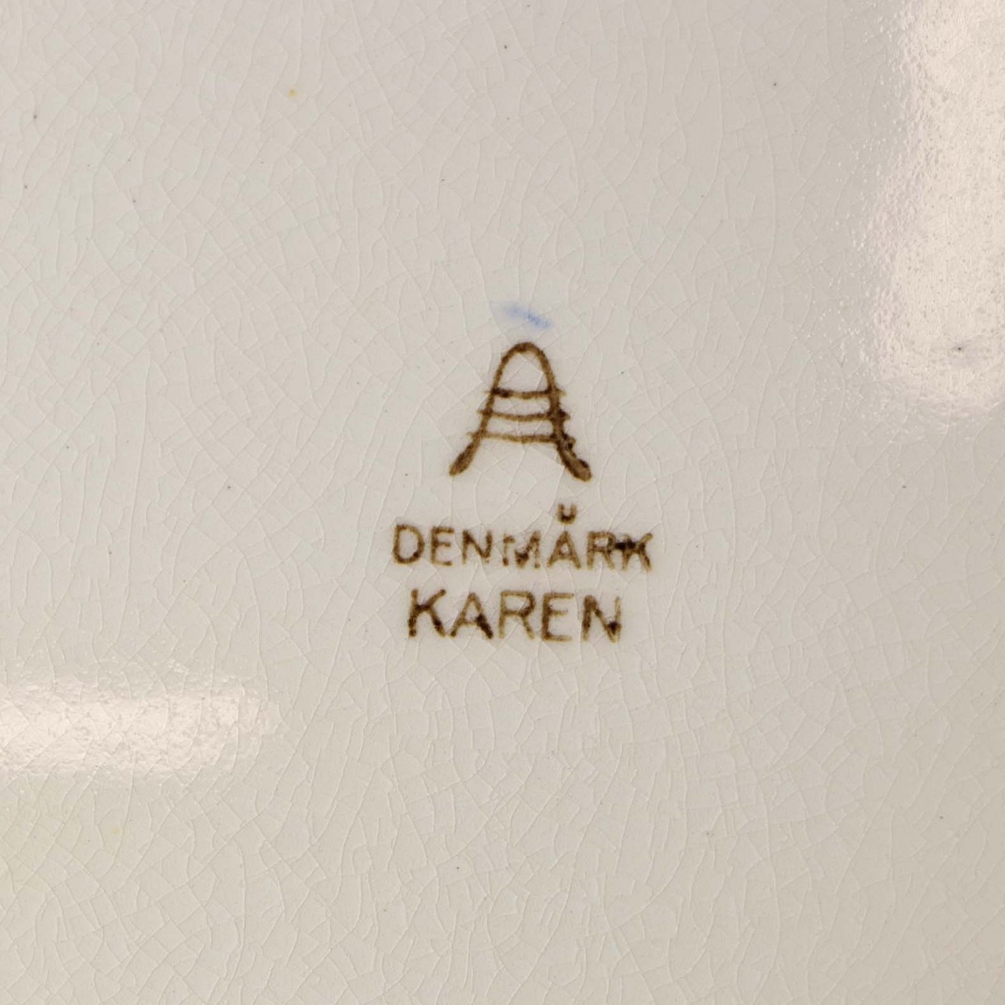 Fremstår med mørkning under glasuren på tallerkens frontside samt krakkeleringer i glasuren.