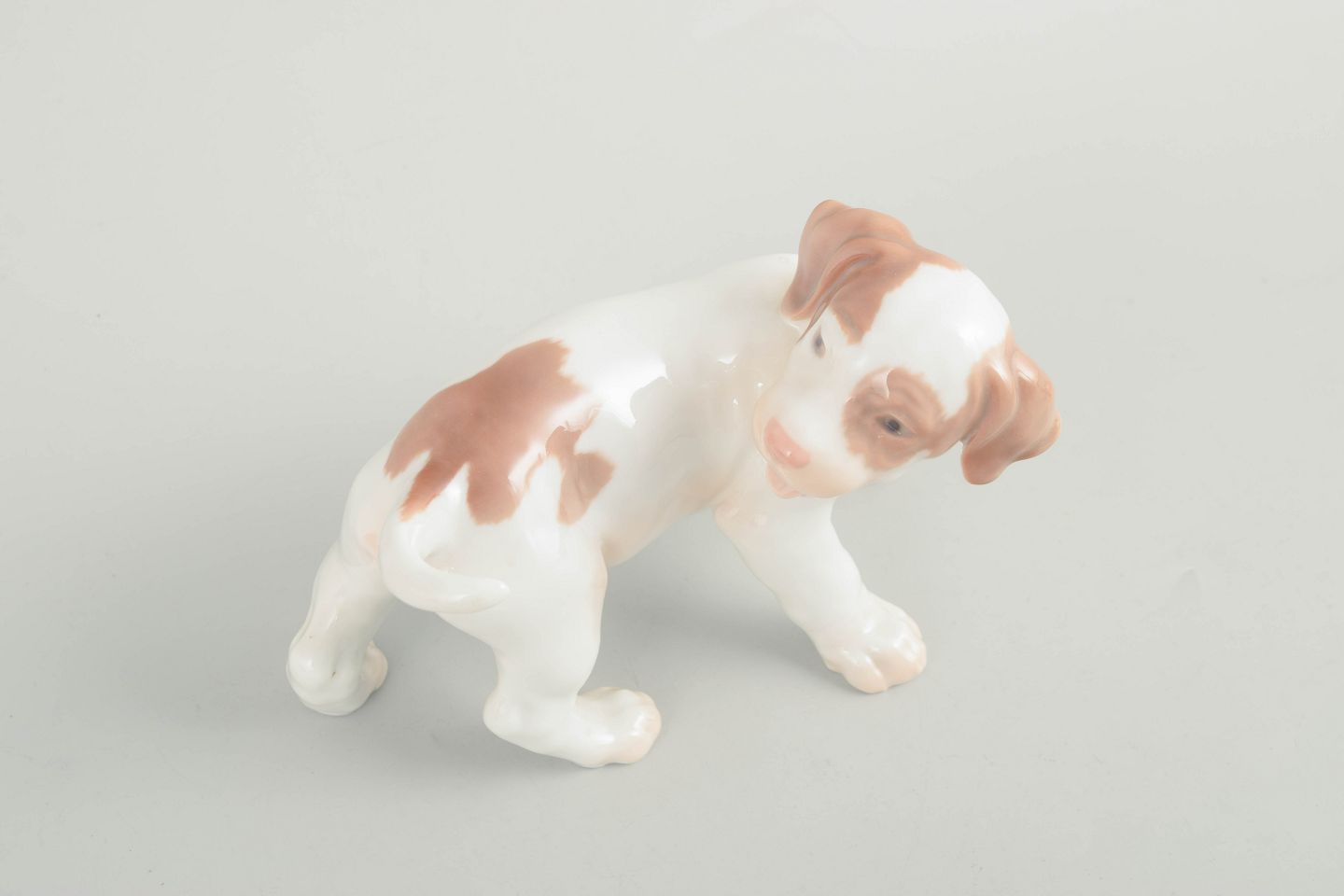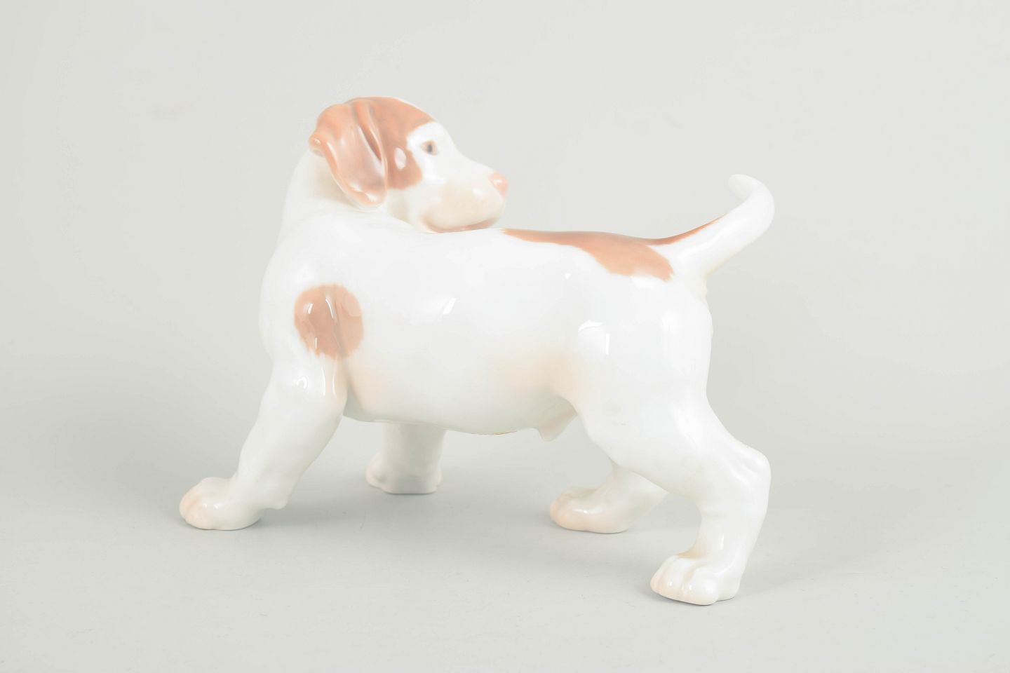 Naturalistically modelled porcelain figurine depicting a standing puppy with soft forms and hand-painted decoration in light brown and cream tones. Model 2026.