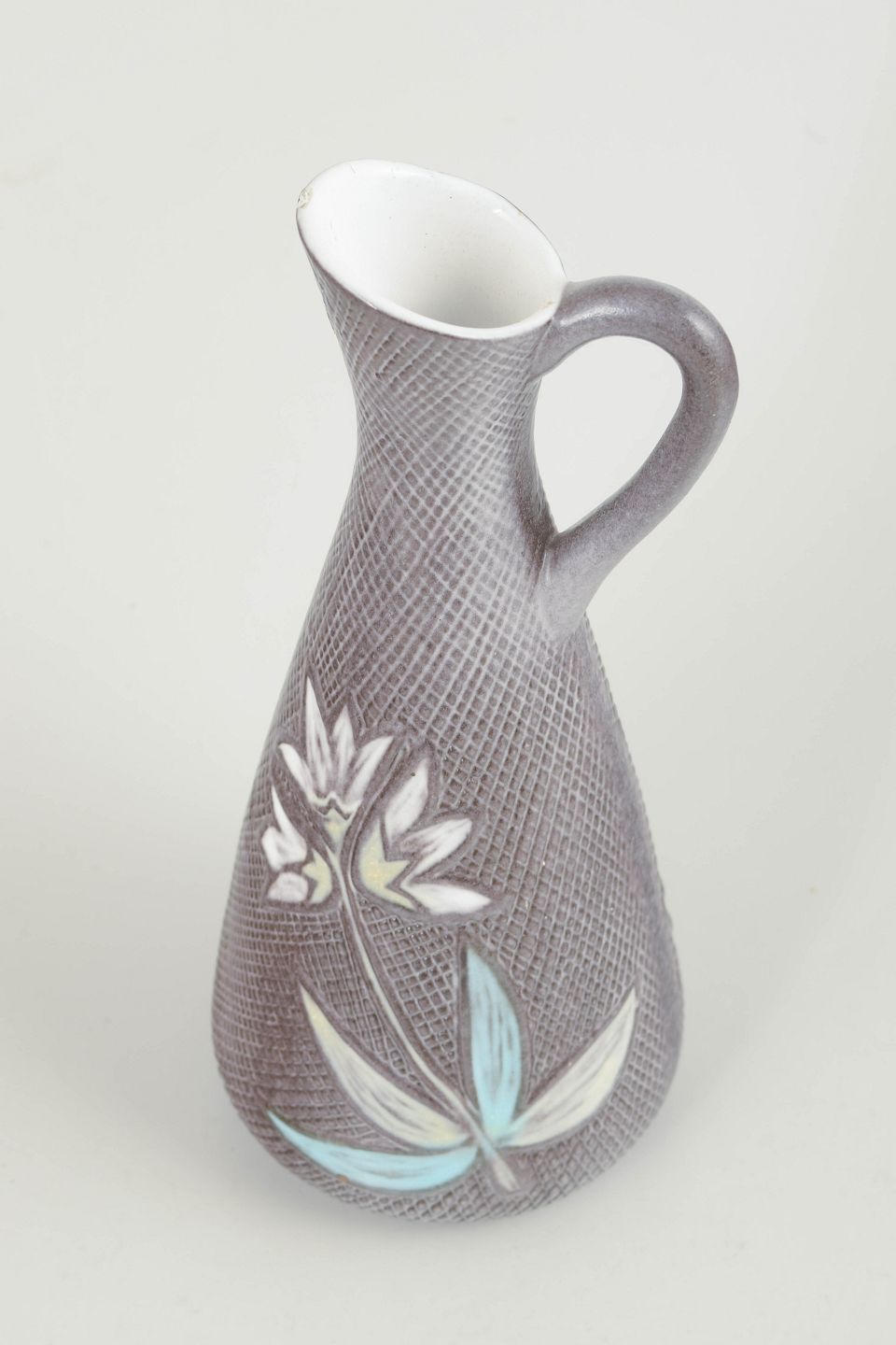Elegant stoneware pitcher with a grey-violet finely textured surface and relief decoration featuring stylised leaves in light turquoise and white tones. Slender organic form with an integrated handle. The base is stamped and marked with model number 4499.
