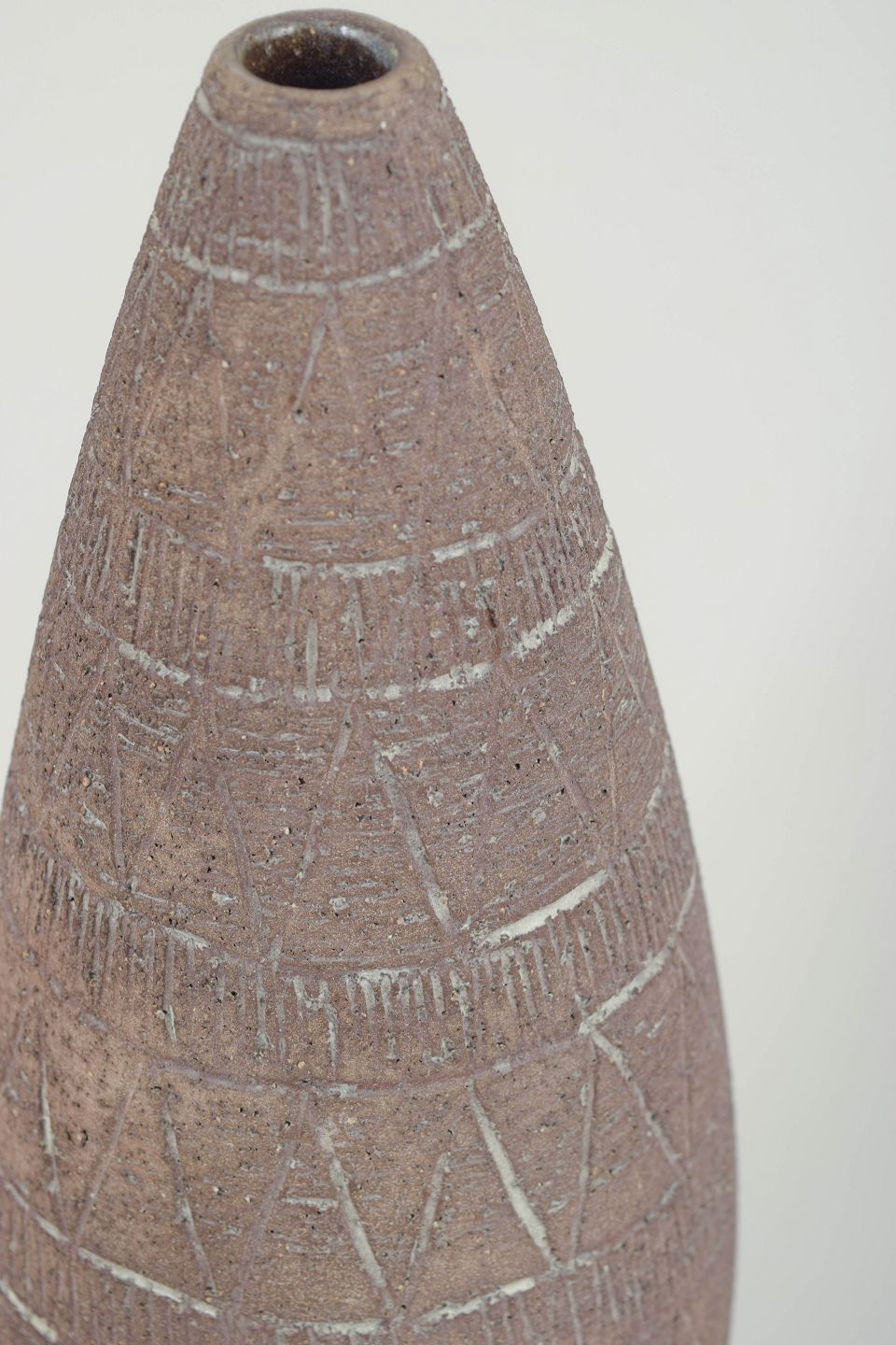 Slender conical vase in thrown stoneware with a raw, matte surface and incised geometric decoration. The stamped mark to the base indicates model 310.