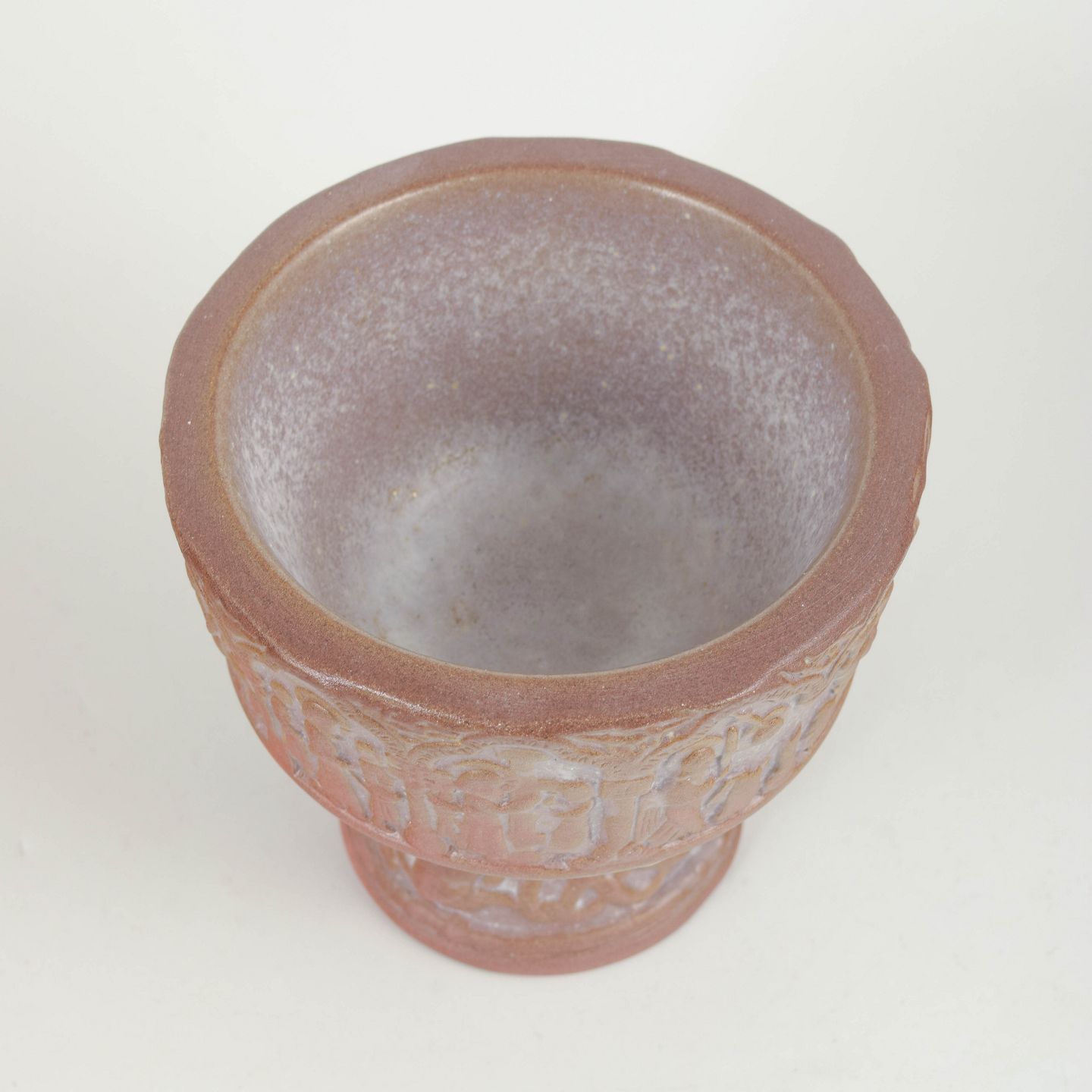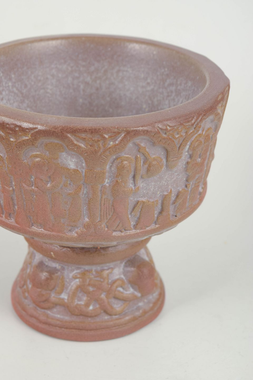 Relief-decorated stoneware baptismal font with figural frieze and profiled foot. Glazed in warm pink and brown tones. The piece bears the factory’s characteristic mark.