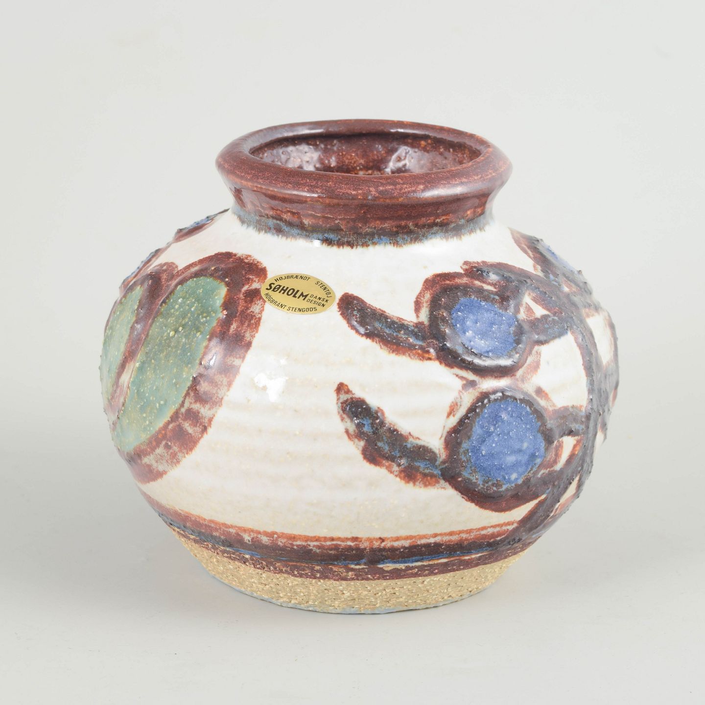 Globular thrown stoneware vase with a light ground glaze and hand-decorated organic motifs in blue, green and brown tones. A characteristic Søholm piece from the period, bearing the factory stamp to the base and retaining original stickers.