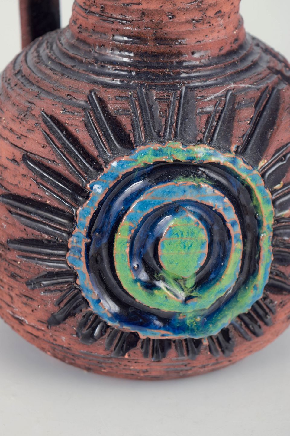 Organically shaped pitcher in thrown stoneware with a coarse, rustic surface in reddish-brown tones and a decorative relief with a circular motif in blue and green glazes. Model 193.