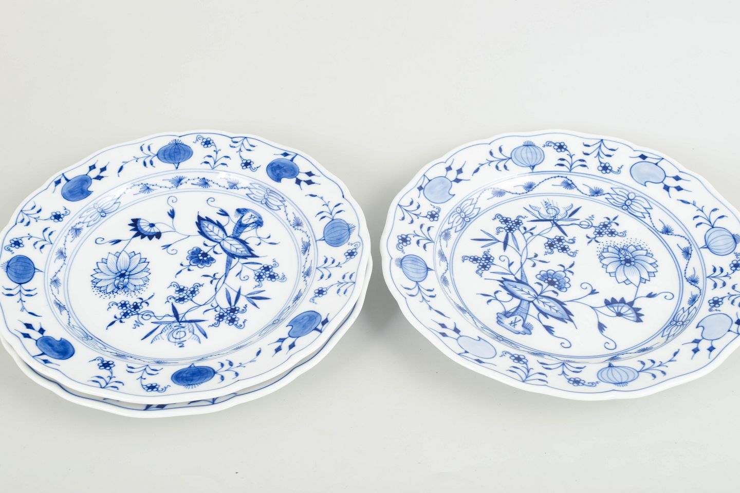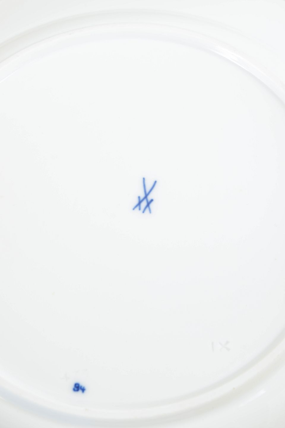 Porcelain dinner plates decorated with the classic Blue Onion pattern. Some first factory quality and some cancelled with two incised lines. Marked to the base with the Meissen crossed swords.