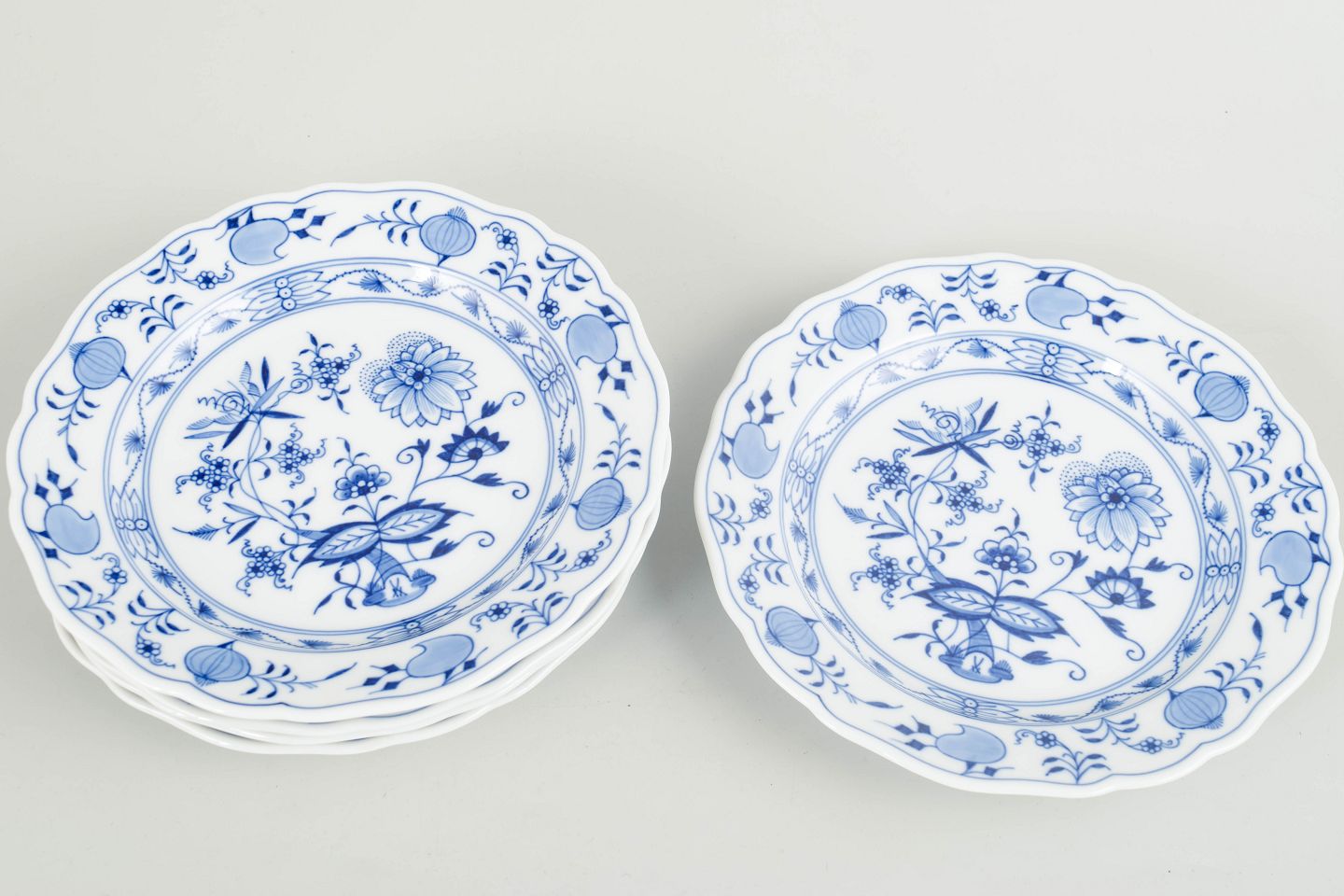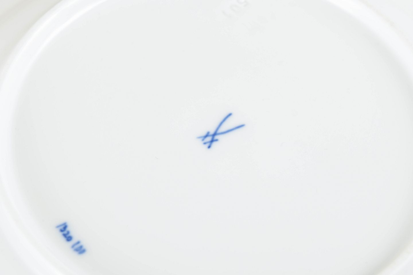 Round porcelain plates decorated with the classic Blue Onion pattern. First factory quality, marked to the base with the Meissen crossed swords.