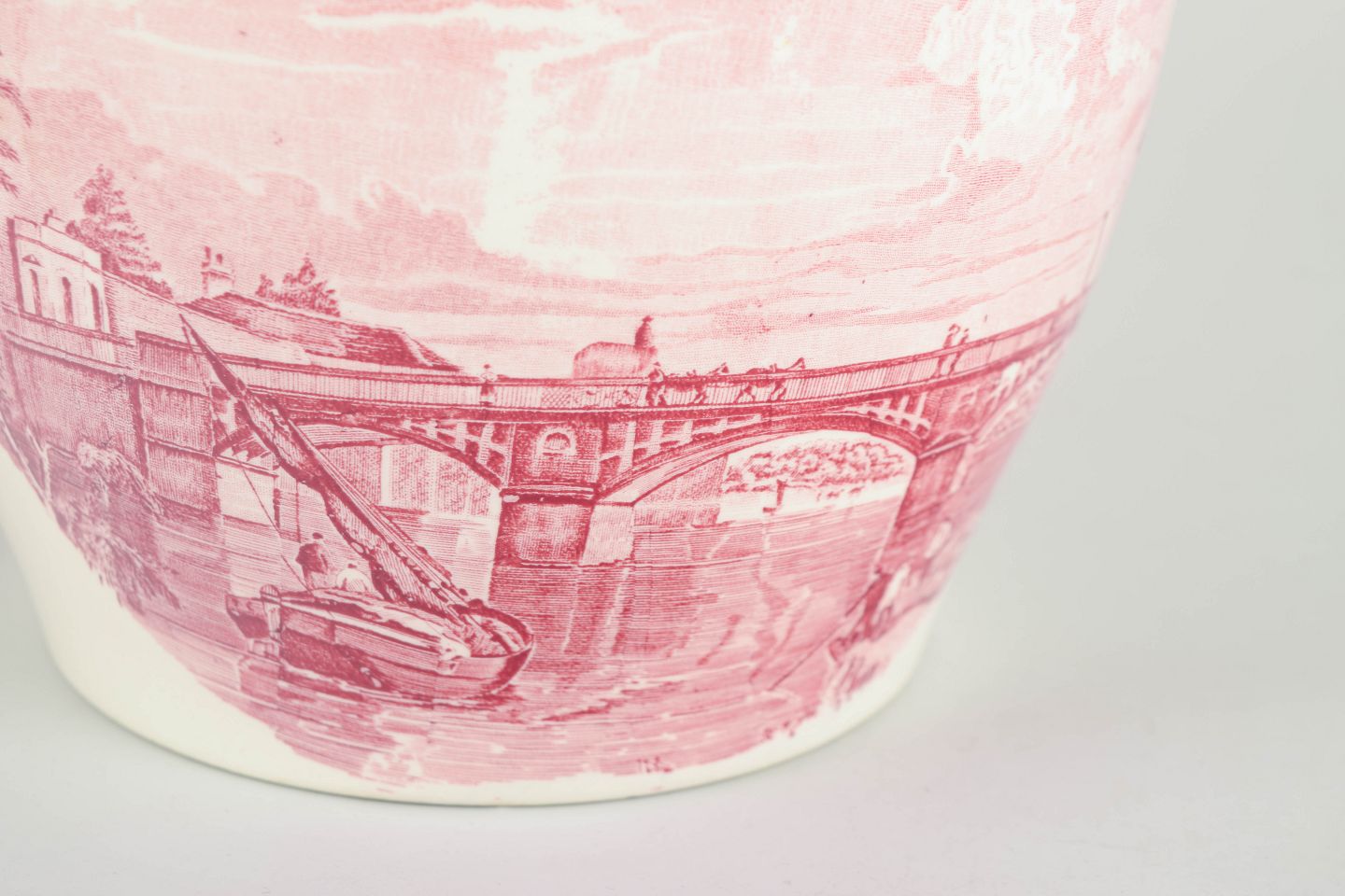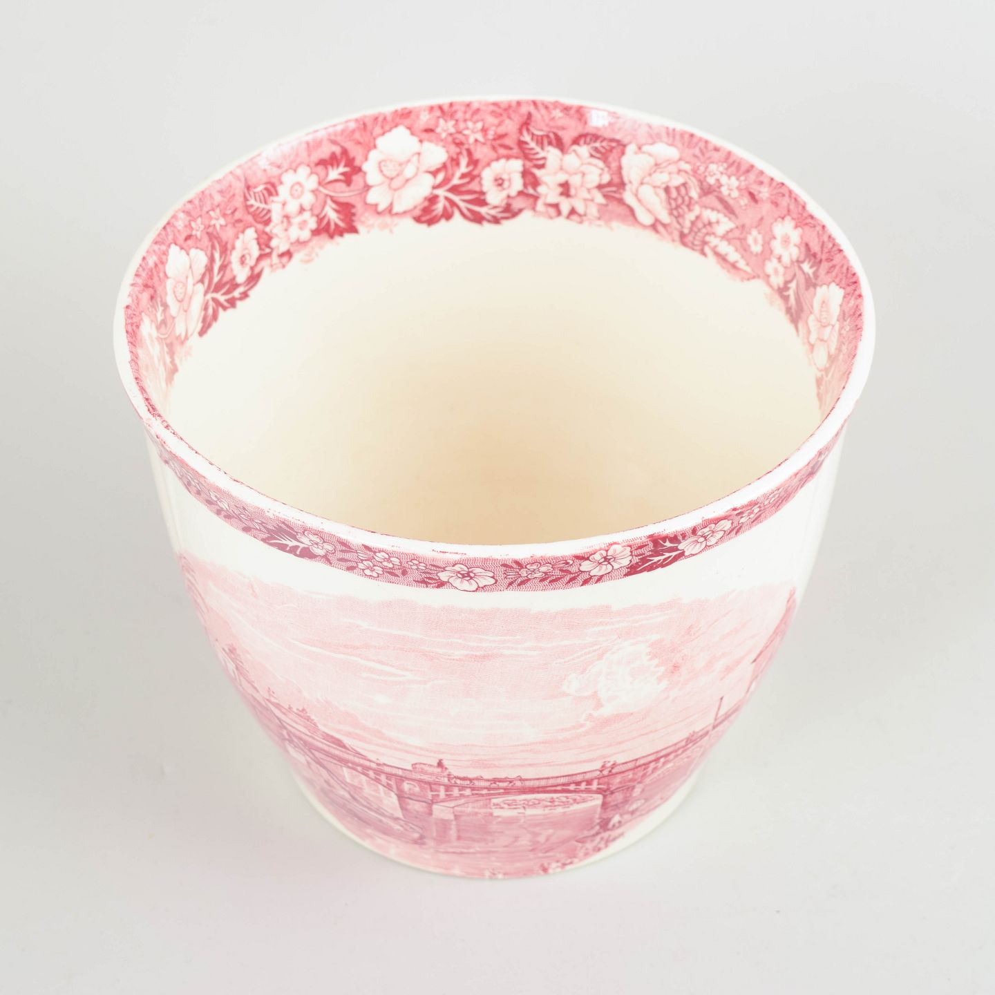 Faience flower pot holder by Palissy Pottery, decorated in red transferware with a Thames river scene and ornamental border.