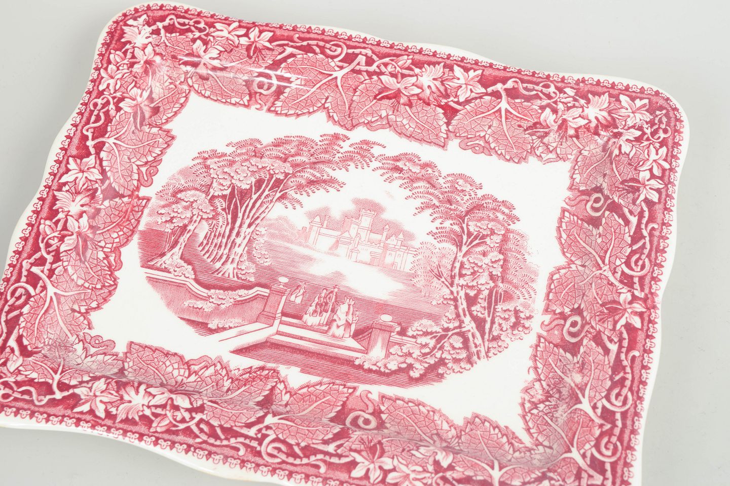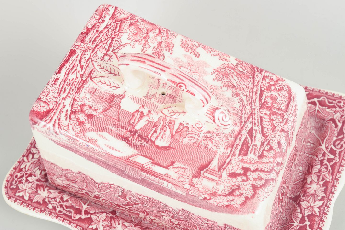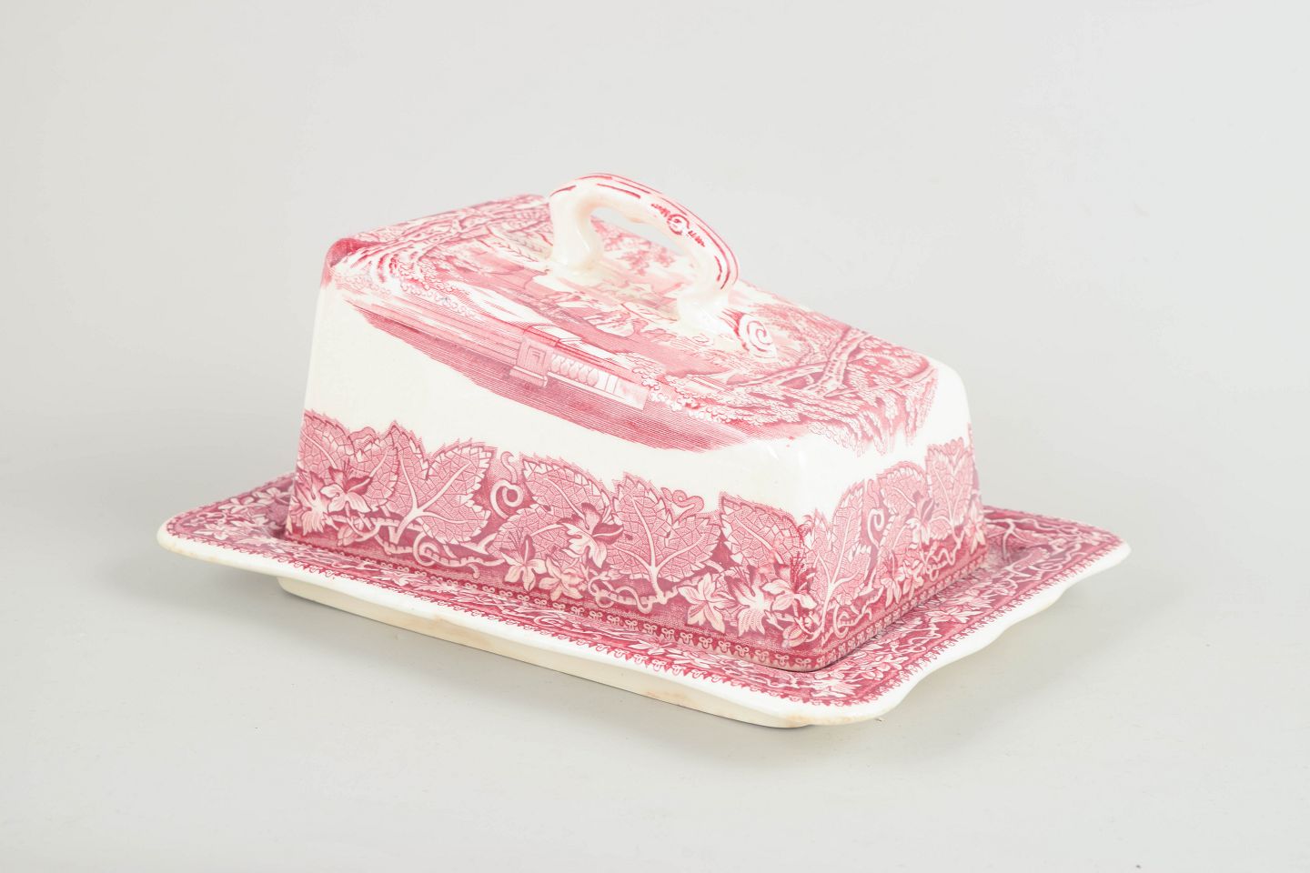 Faience cheese dome by Mason’s, decorated in red transferware with ornate border motifs.
