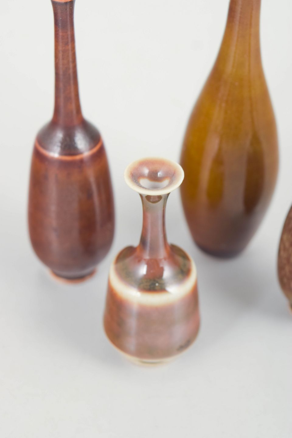 Small thrown stoneware vases with elegant, well-balanced silhouettes and expressive glazes in warm earthy tones. Characteristic of Höganäs studio production with a clear focus on form, proportion, and surface quality.