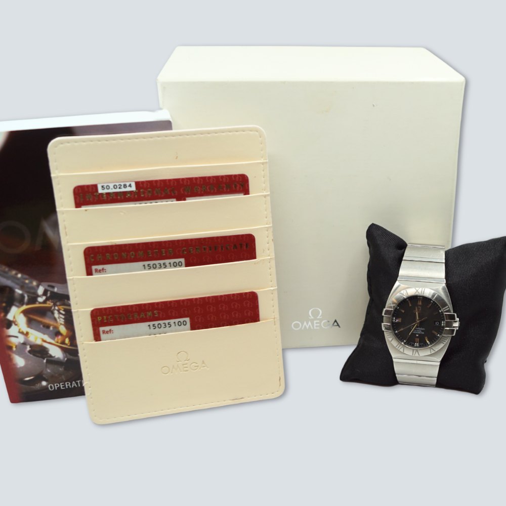 Omega; A gentleman's wristwatch model Constellation Double Eagle. Steel with steel strap. Co-axial chronometer. Ref. 15035100. Cal: 2500. Automatic. Omega men's watch, purchased from new on 12/09/07. Watch diameter 42 mm. With original box and documents. Extra link included.
