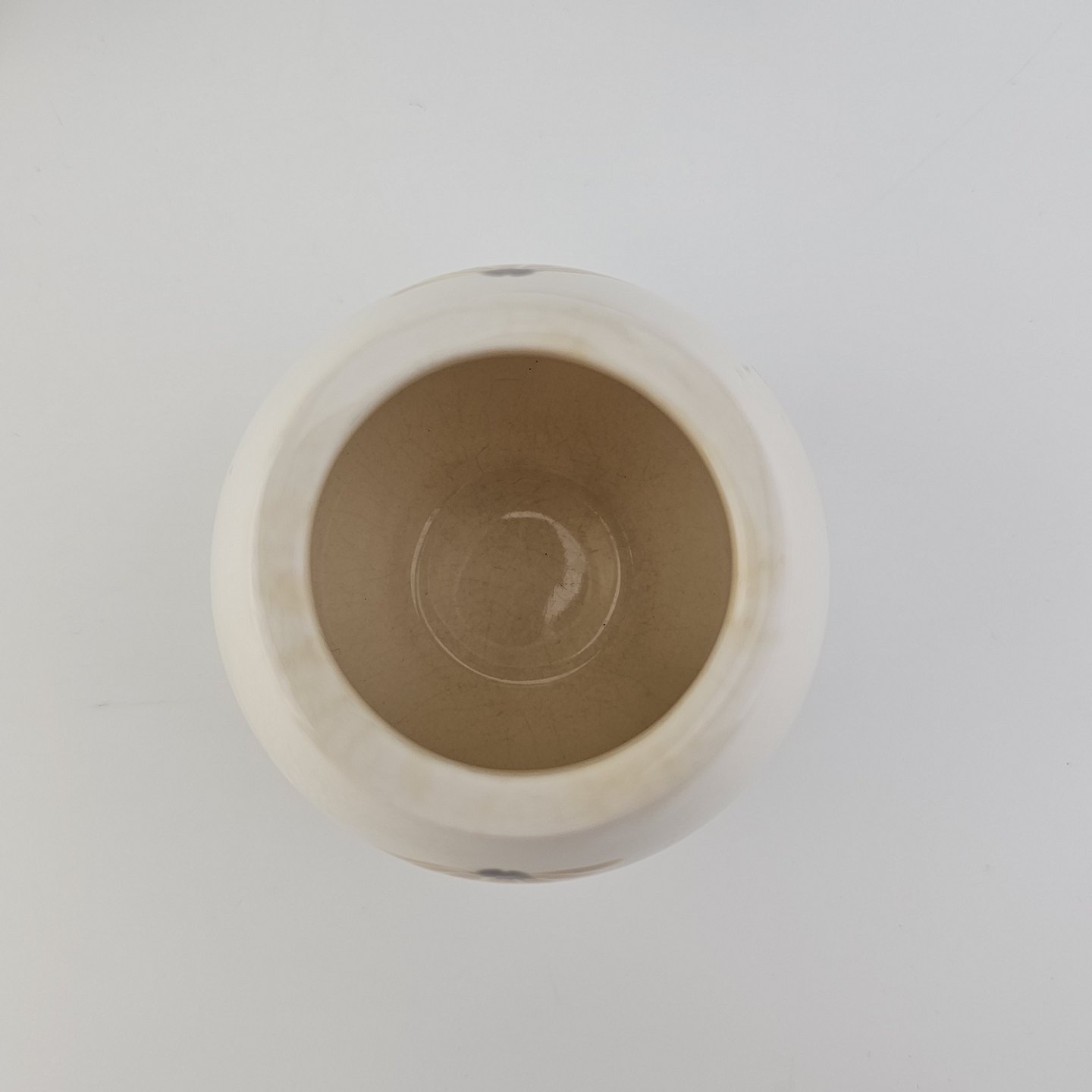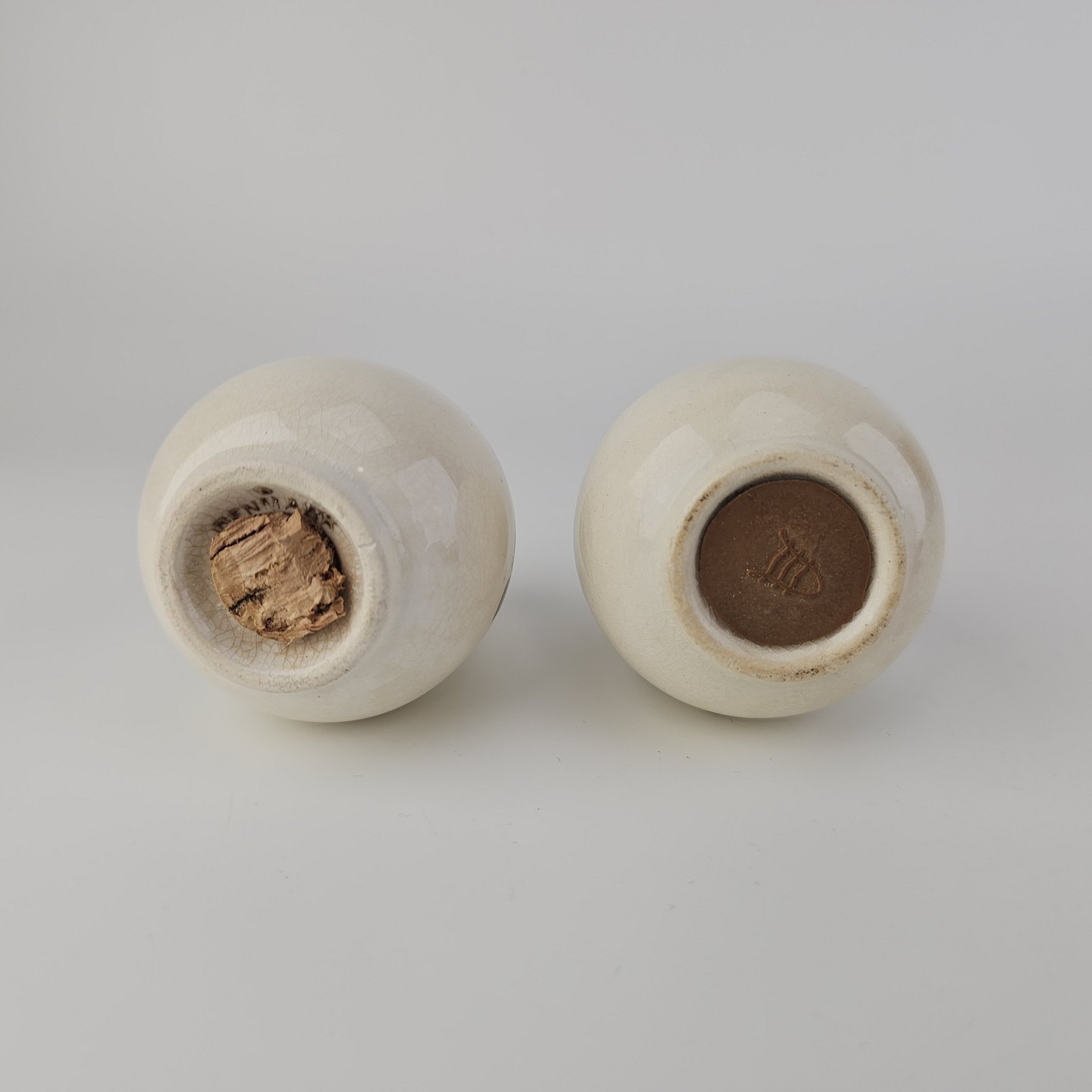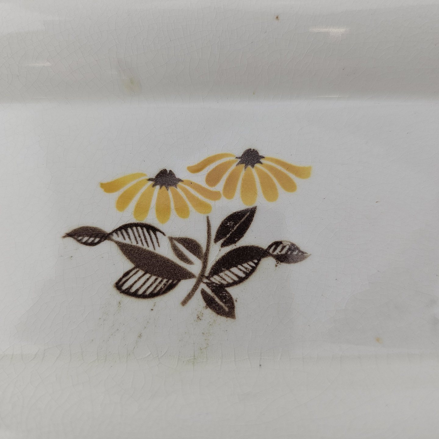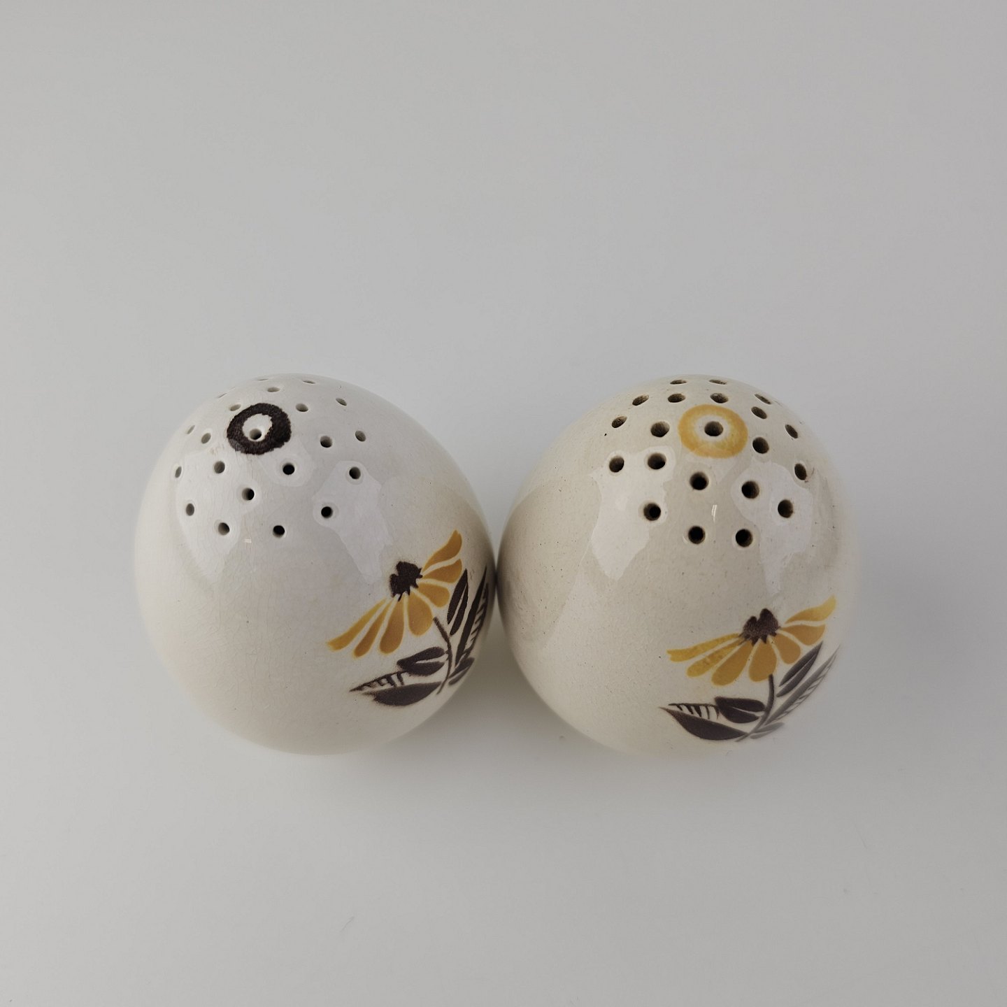 Trekantet fad med sennepskrukke, saltbøsse og peberbøsse i fajance fra stellet Birthe
