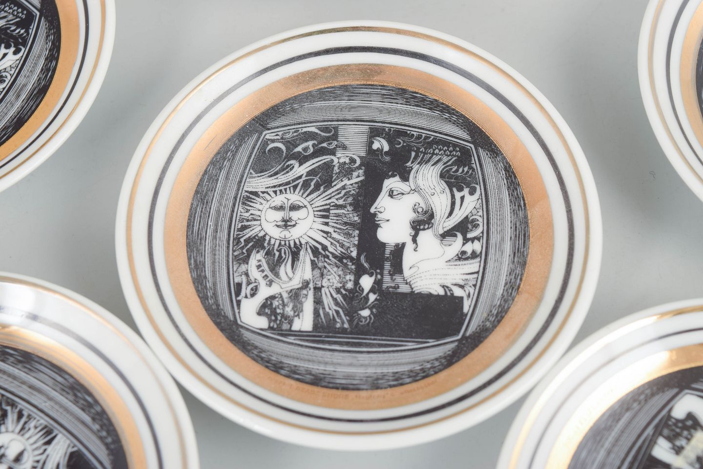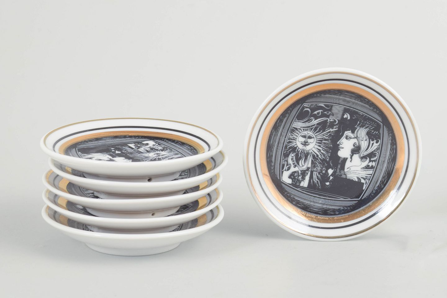 Set of six round porcelain coasters with black and white graphic decoration and gilt details. Produced as a limited edition.