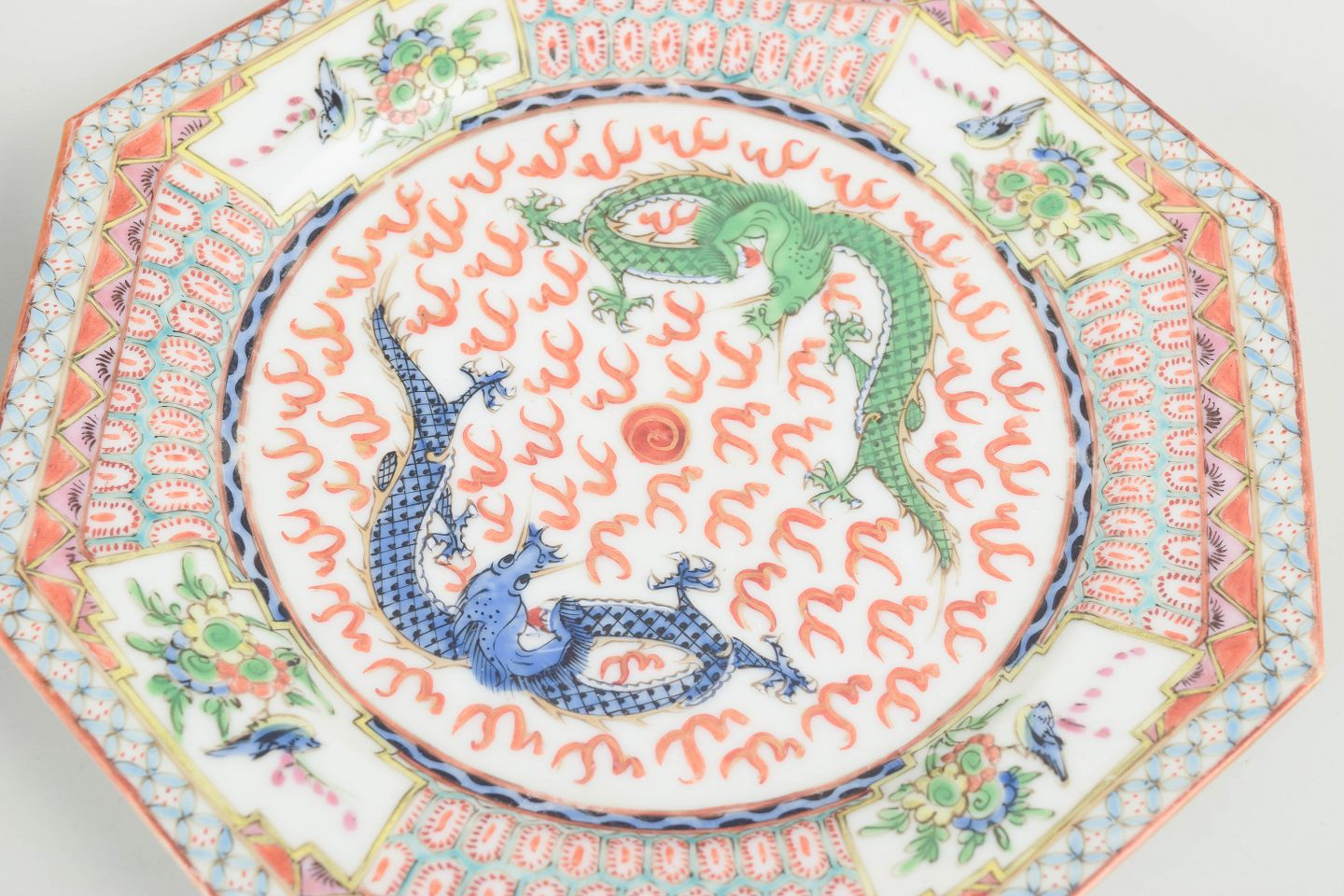 Octagonal porcelain plates, hand-painted with polychrome decoration featuring dragons and stylised motifs in iron-red, green and blue tones, framed by geometric and floral borders. Made for the export market.