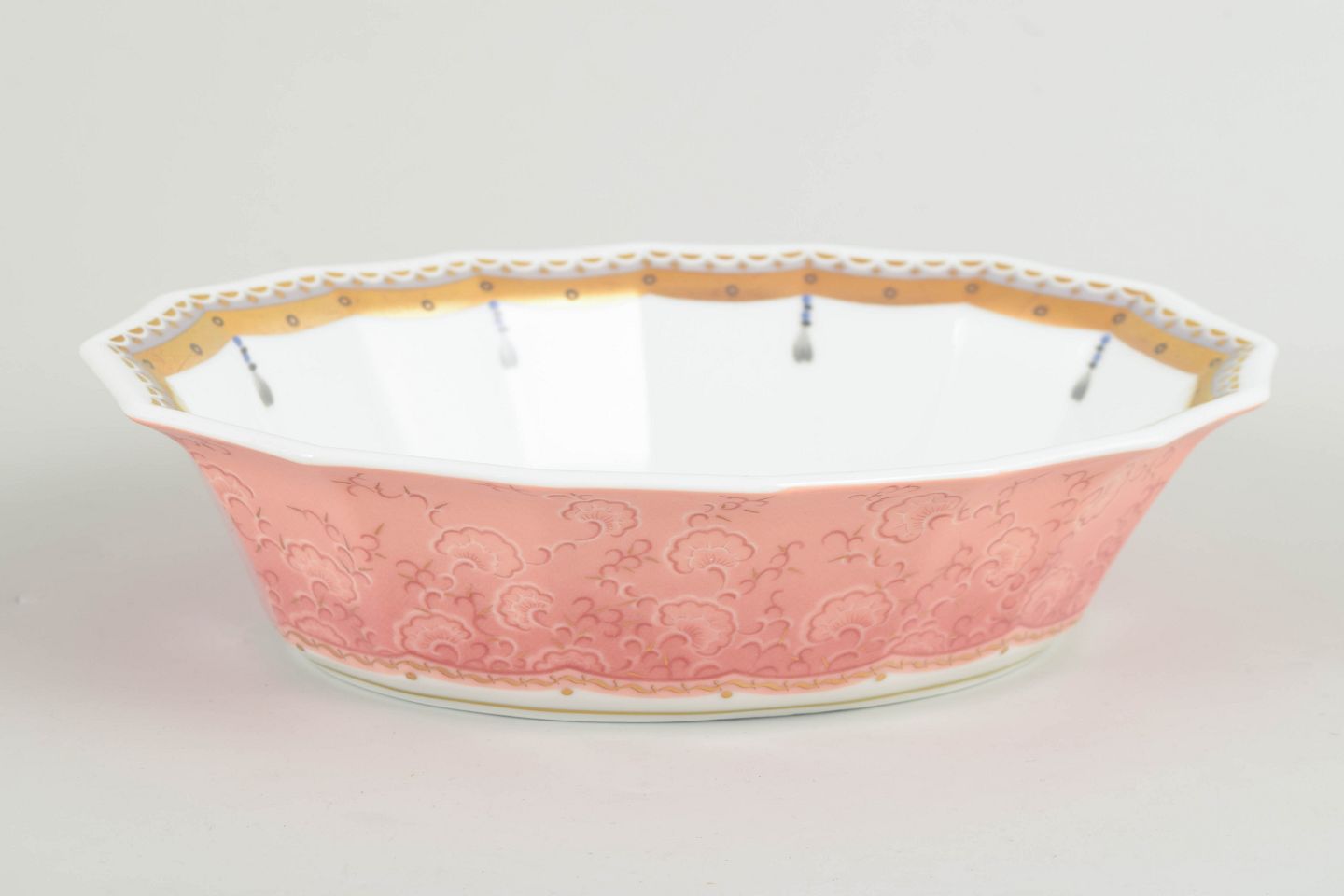 Low, wide bowl in white porcelain decorated with the Fairytale pattern in soft pink and golden tones with delicate ornamental detailing. This model was produced between 1992 and 1999 and is of first factory quality. Model 579.