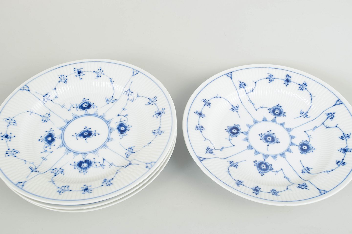 Set of 4 dinner plates in white porcelain decorated with hand-painted cobalt blue Blue Fluted Plain pattern. Model 1/575.
