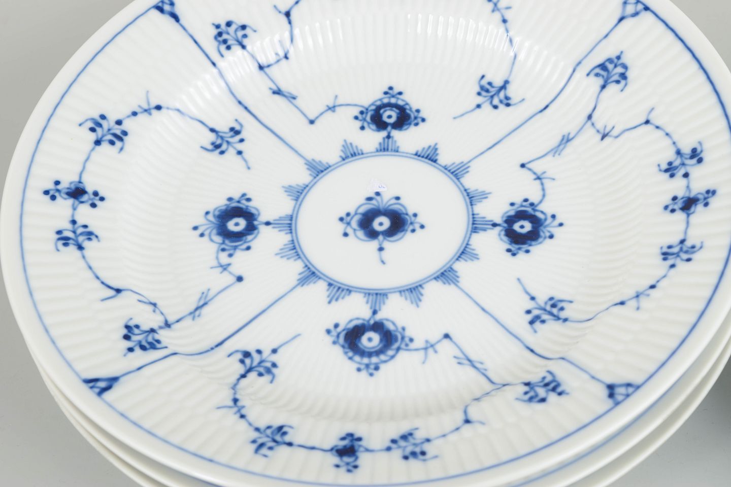 Set of 4 dinner plates in white porcelain decorated with hand-painted cobalt blue Blue Fluted Plain pattern. Model 1/575.