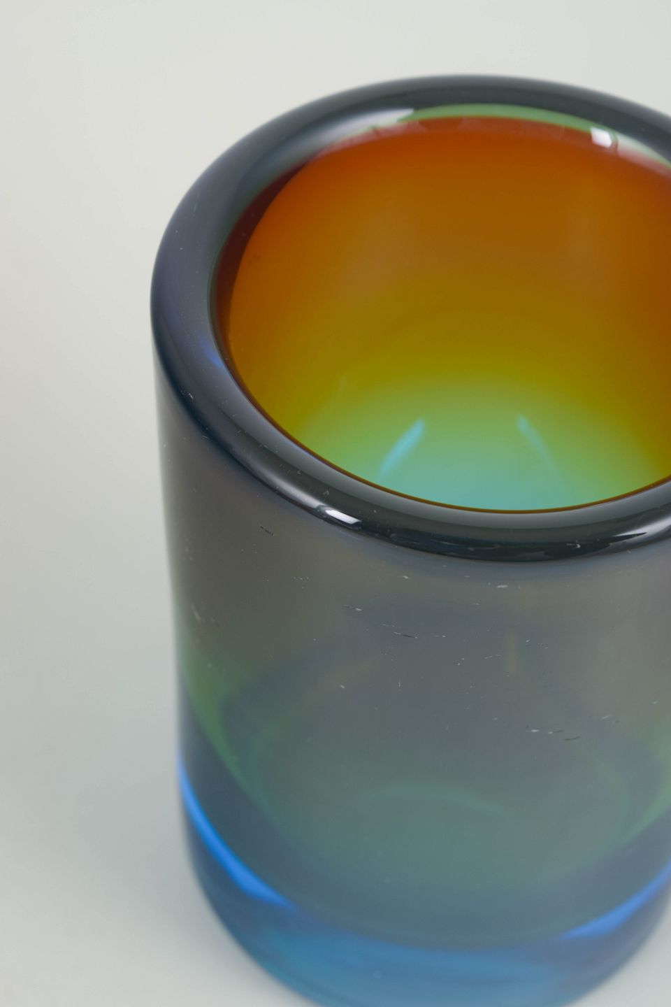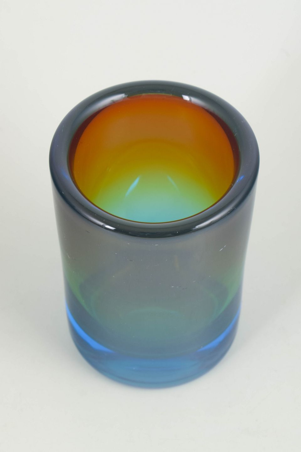 Cylindrical art glass vase in thick clear glass with a multicoloured gradient in blue, green, and warm tones. The model is characterised by a heavy base and evenly ground edges.