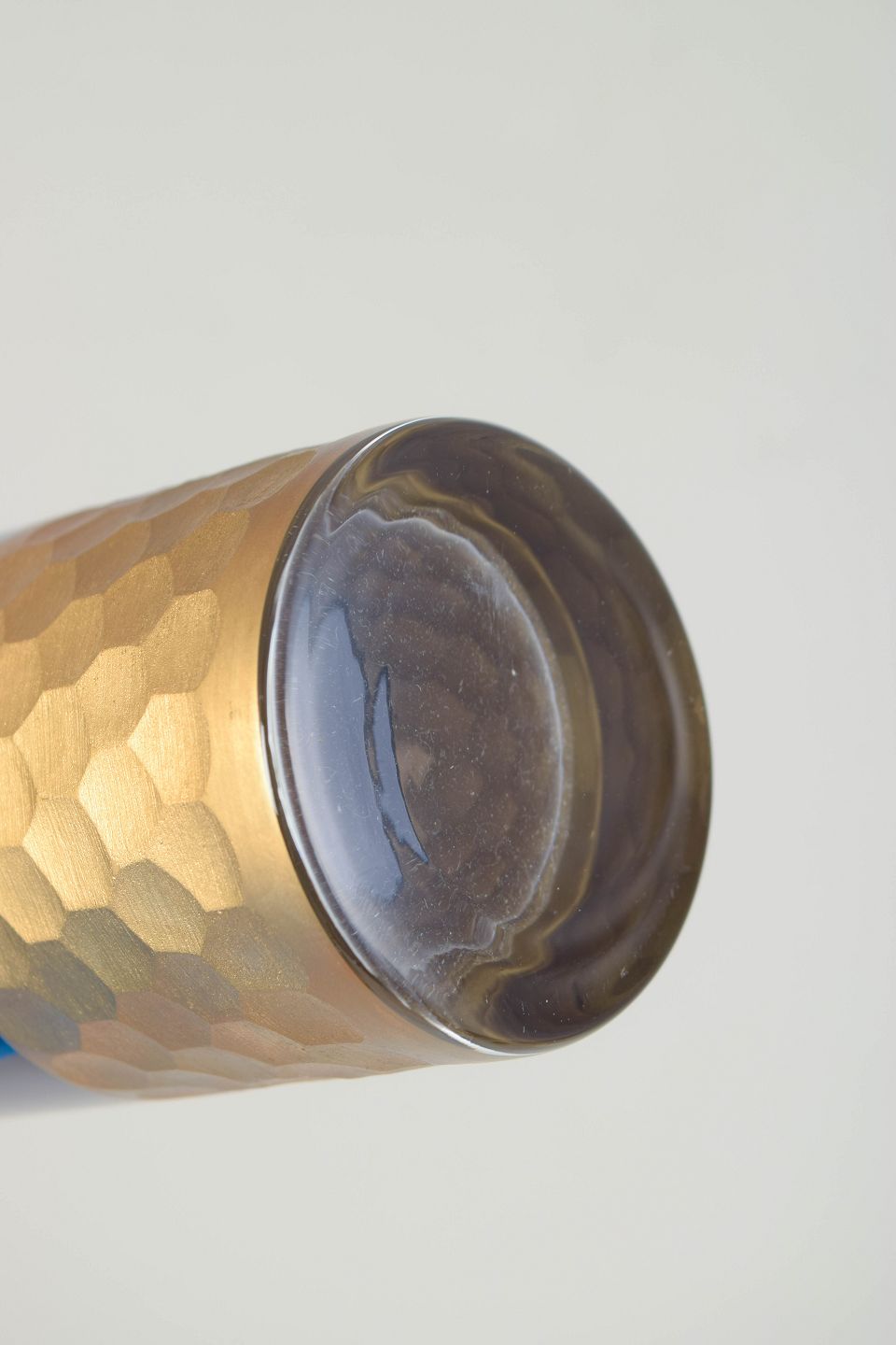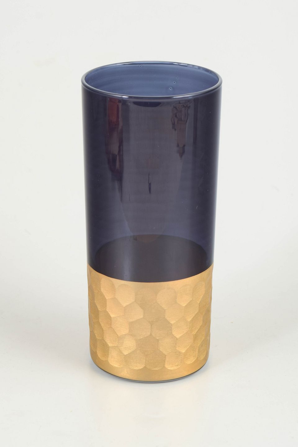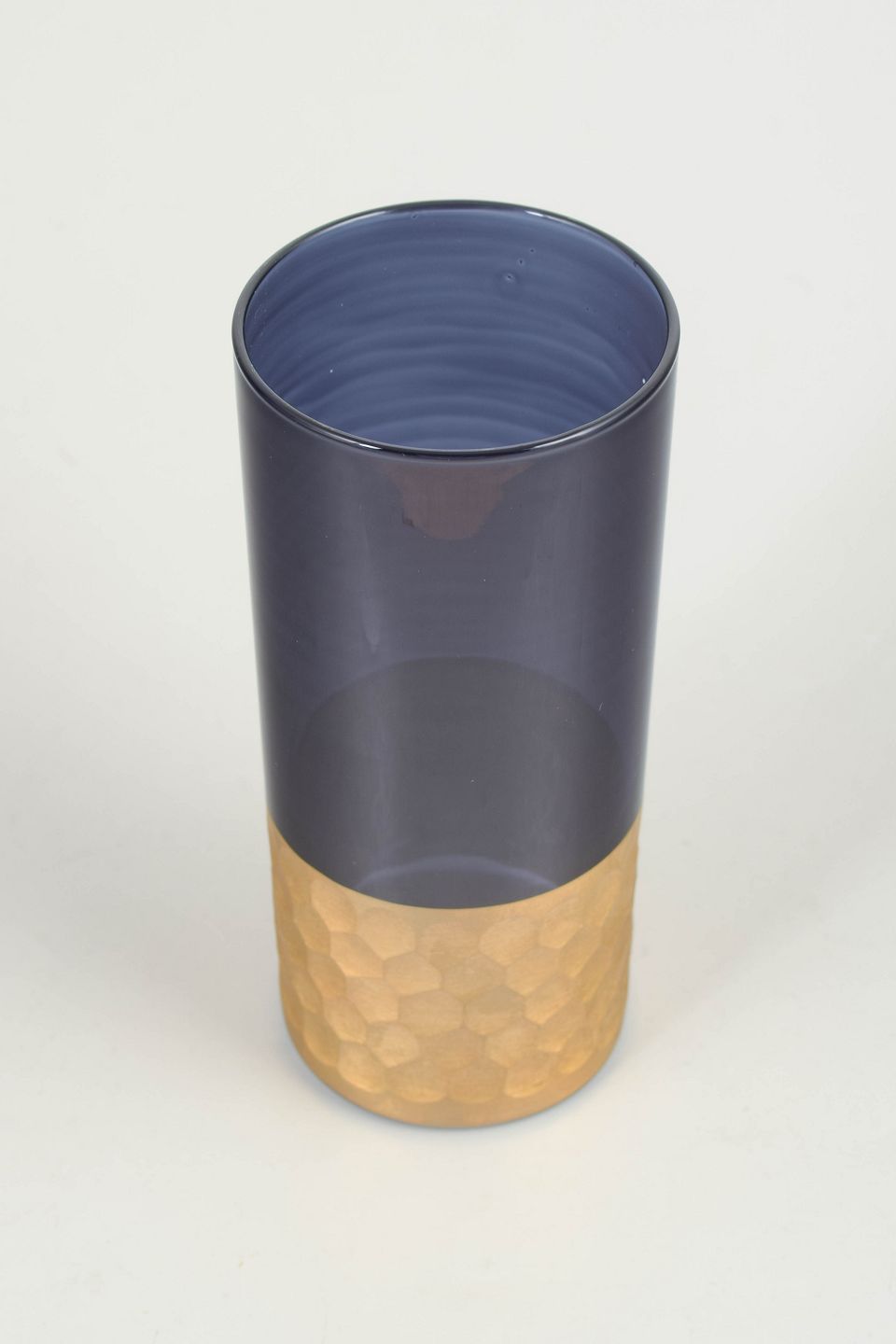 Cylindrical vase in mouth-blown glass with a clear cobalt blue upper section and a substantial base in hammered gilt metal. A restrained, modern form defined by the contrast between transparent glass and the textured metal base. Unsigned.