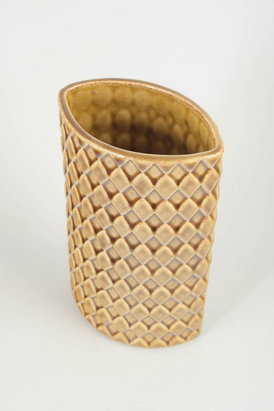 Cylindrical ceramic vase with a relief patterned Harlekiini surface and a warm yellow-brown glaze. The Harlekiini model is known for its tactile diamond relief that creates a lively interplay of light across the glazed surface.