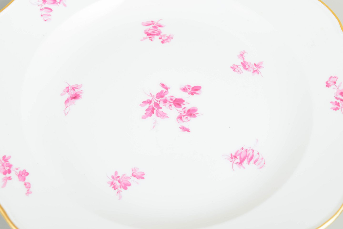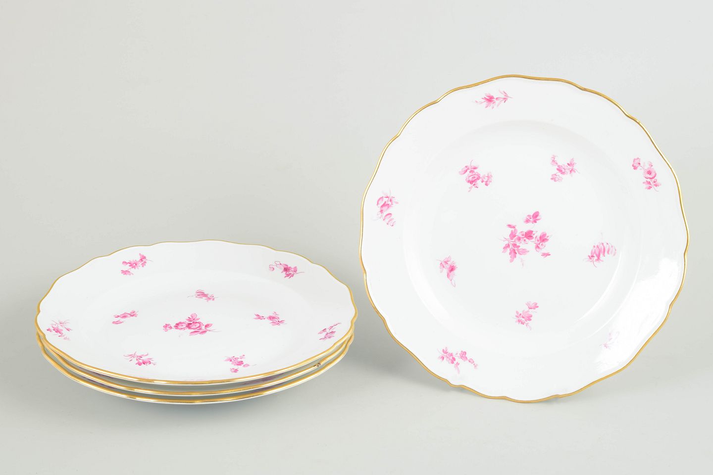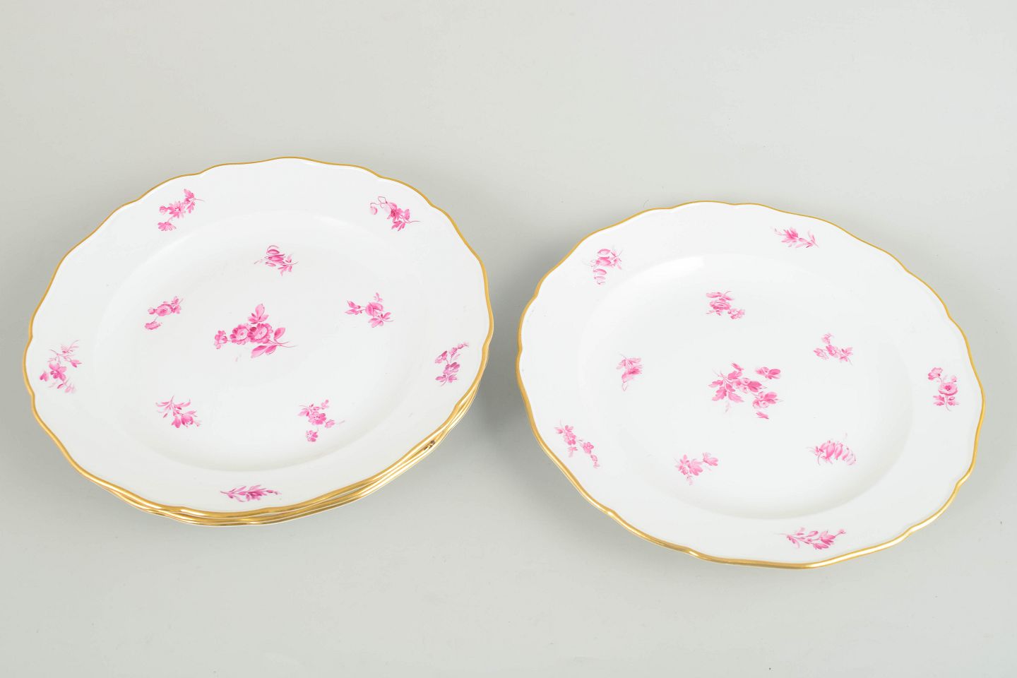 Porcelain dinner plates with softly scalloped rims, gilt edges and hand-painted decoration in pink floral motifs. A classic Meissen design from around 1900.