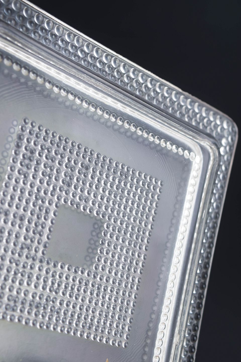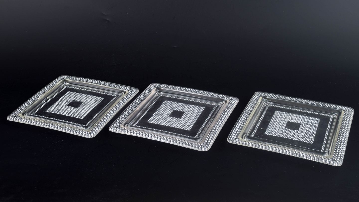 Set of three square plates in clear art glass with geometric relief and a defined central field. Pressed glass.