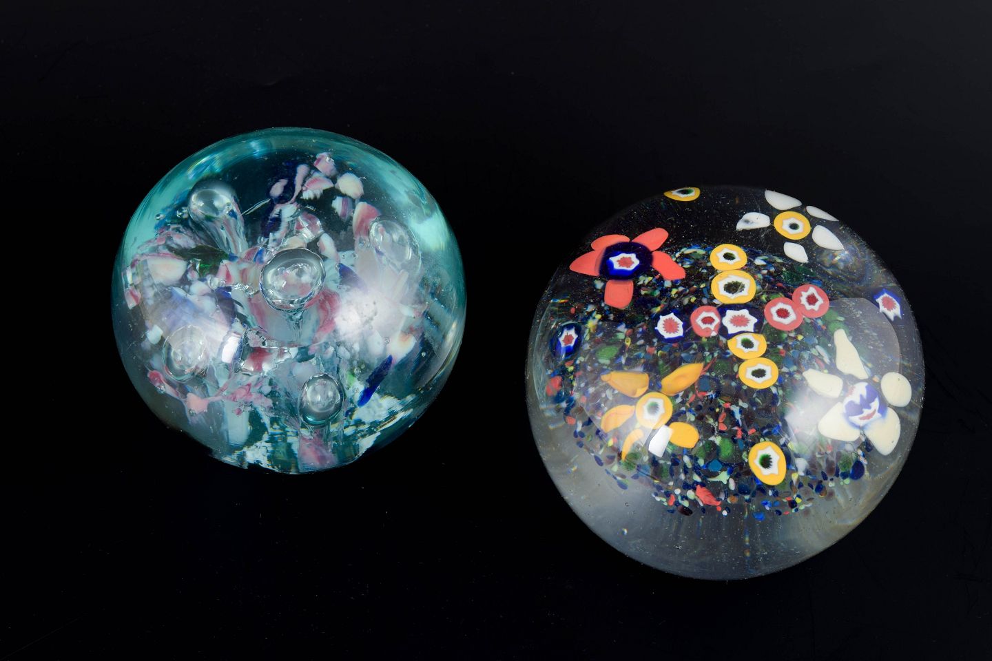 Two Spherical paperweights in clear art glass with internal colour elements, including layered structures, scattered air bubbles and decorative inclusions in contrasting colours. Unsigned.