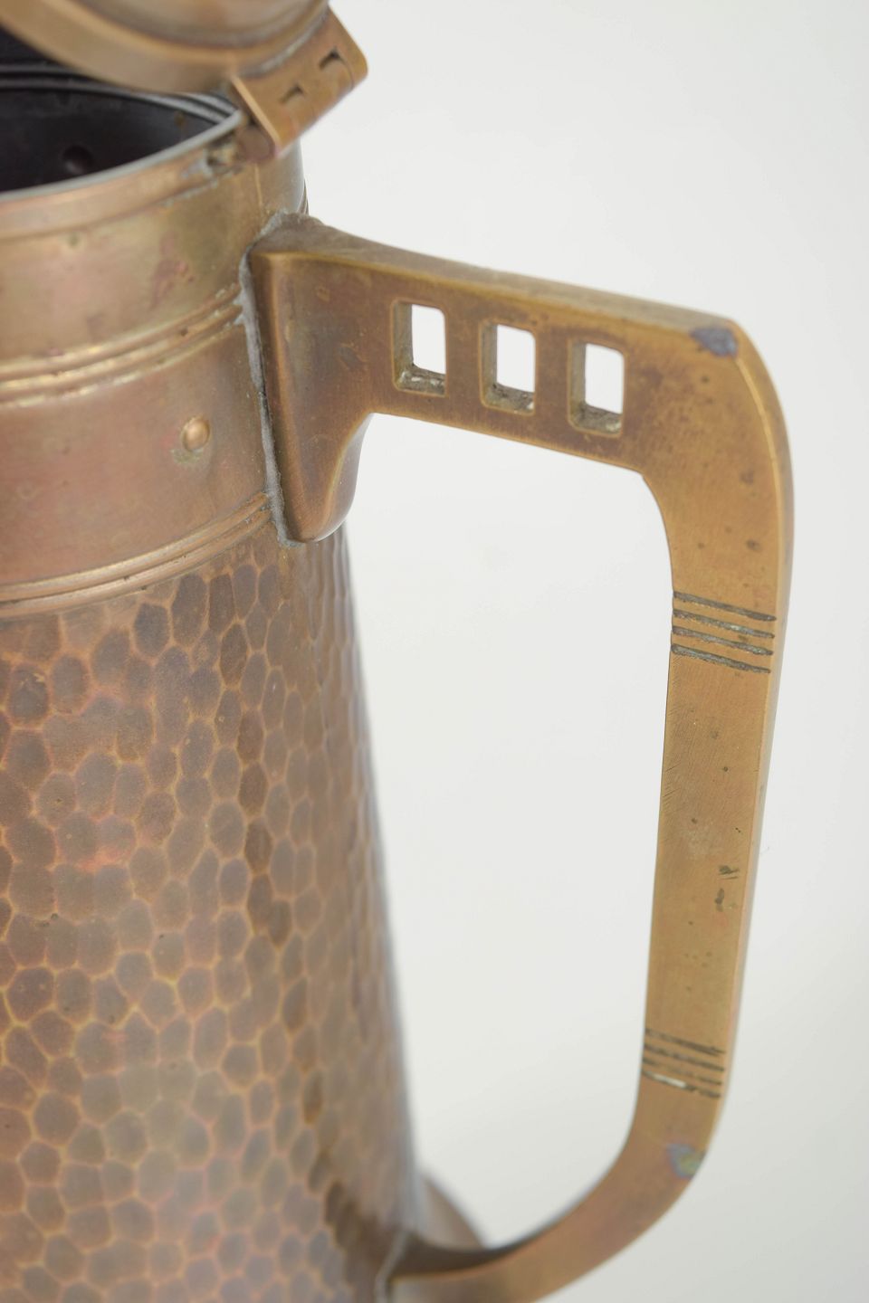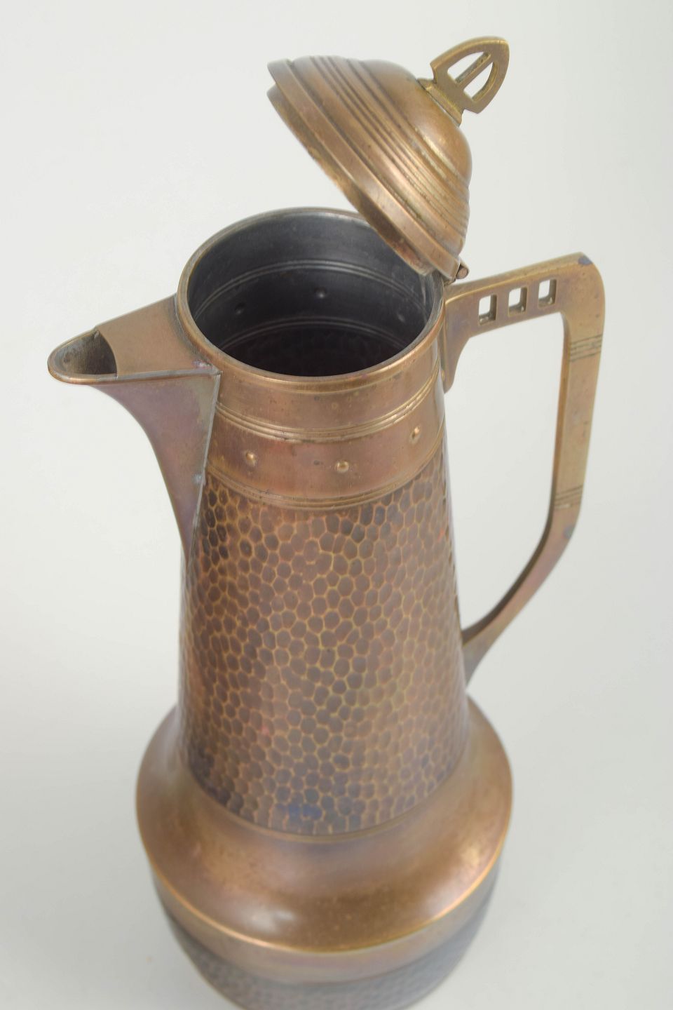 German copperware around 1900 was strongly influenced by the Art Nouveau movement, where functional objects were combined with refined artistic design. Hammered surfaces, geometric details and balanced proportions were typical of the period. Large coffee pots of this type were commonly used in private homes and cafés, reflecting the era’s emphasis on craftsmanship, durability and aesthetic quality.